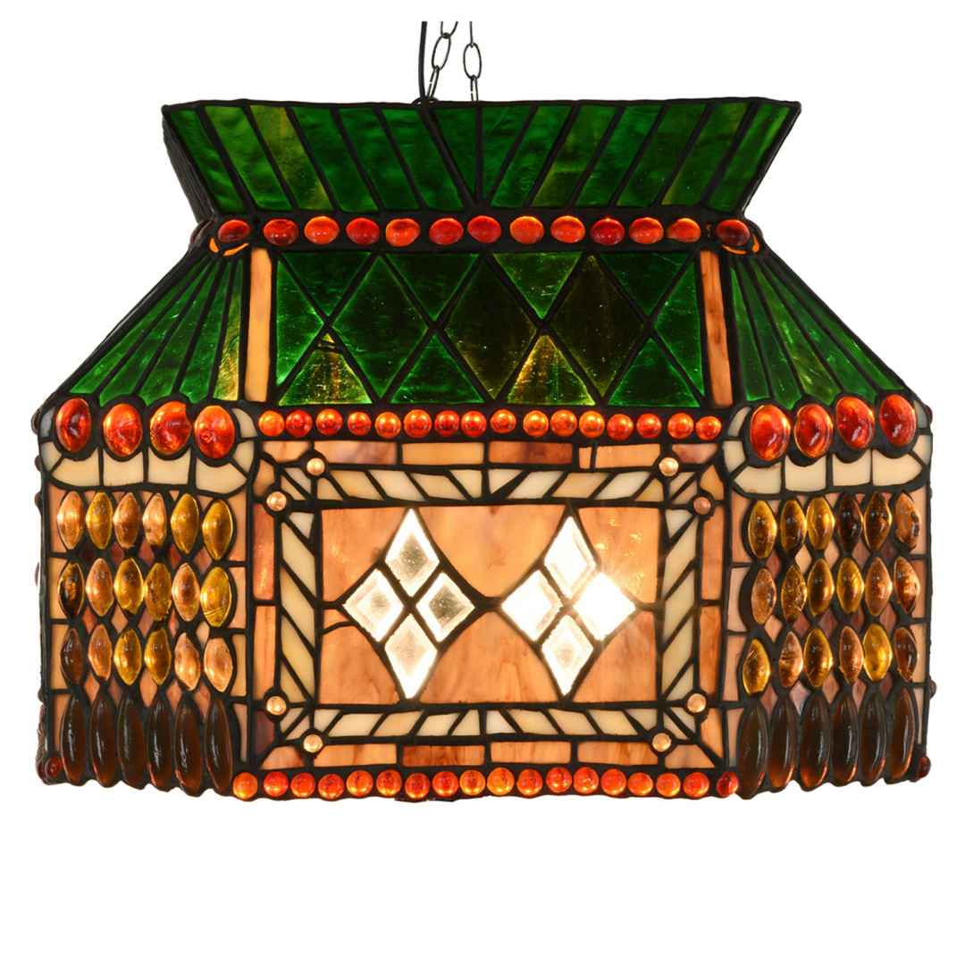 Ciekawy kształt tej oryginalnej lampy z przepiękną mozaiką z kolorowych szkiełek, zachwyca wzorem i grą barw. Lampa odnajdzie się w jadalni lub salonie zawieszona nad stołem. Sprawdzi się również nad stołem bilardowym.