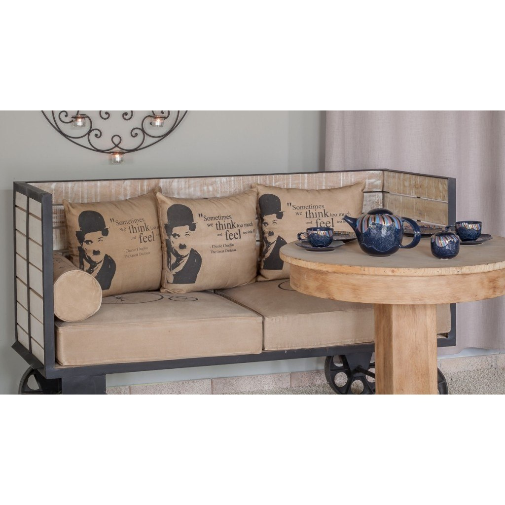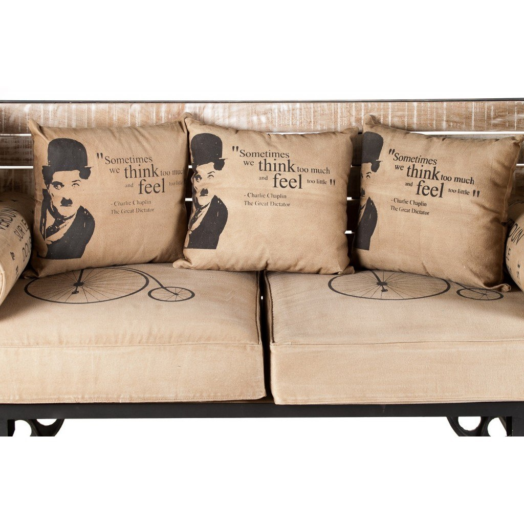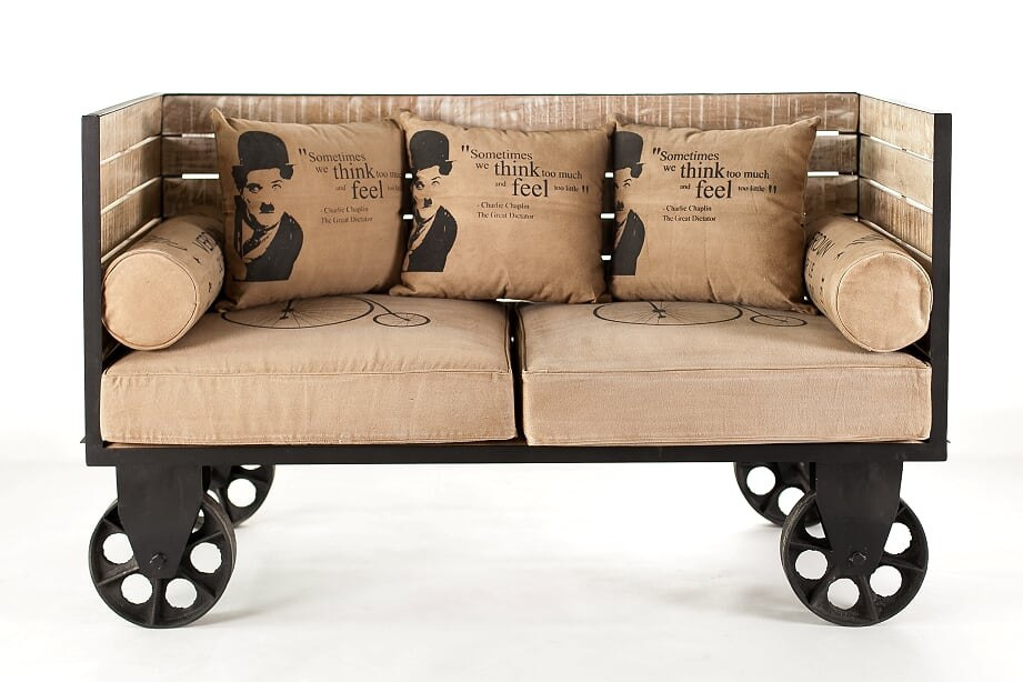 Designerska sofa z wizerunkiem Charliego Chaplina w stylu industrialnym, marki ALURO, wykonana z połączenia żeliwa i drewna.