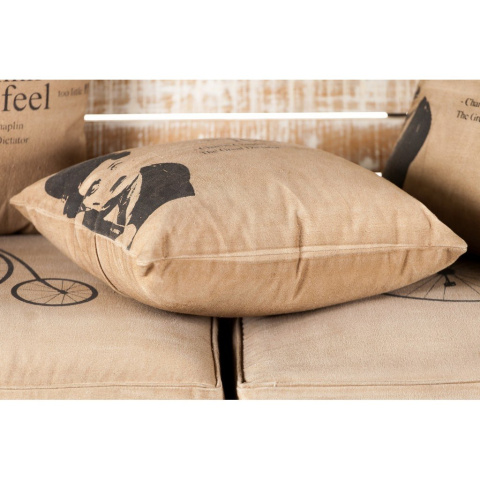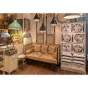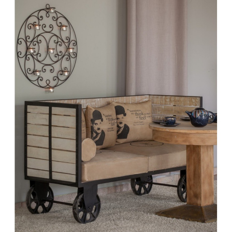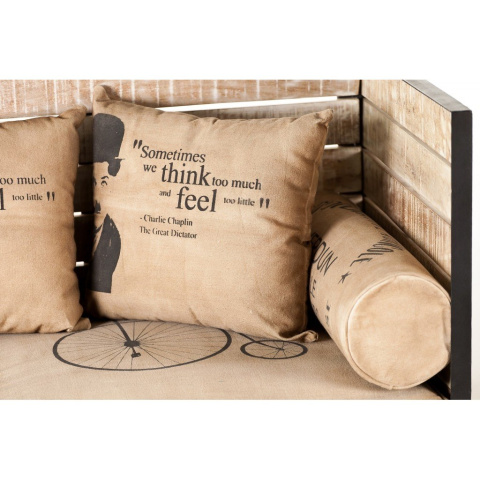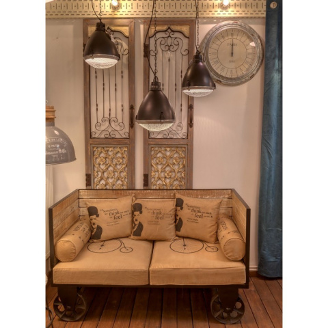 Designerska sofa z wizerunkiem Charliego Chaplina w stylu industrialnym, marki ALURO, wykonana z połączenia żeliwa i drewna.
