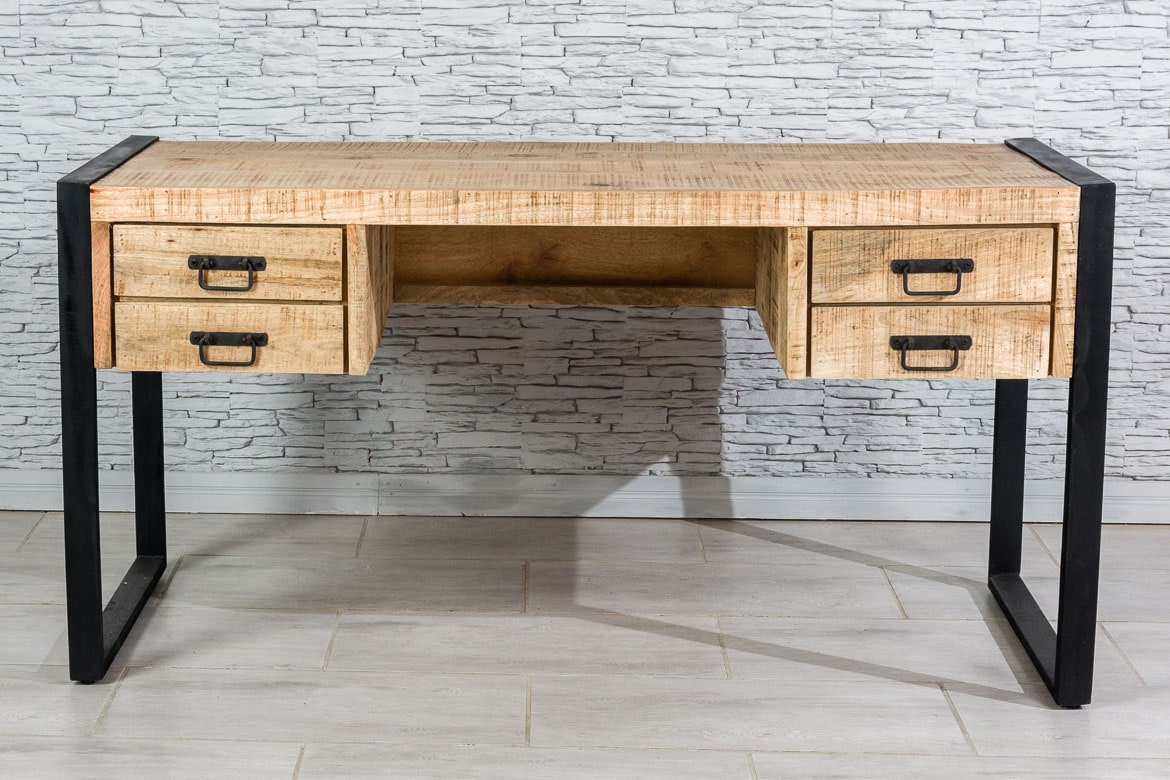 Drewniane, loftowe biurko indyjskie z czterema szufladami.