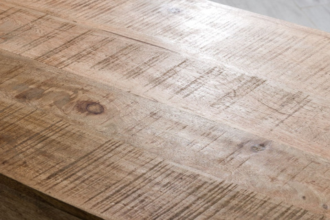 Biurko wykonane z karbowanej deski mango i malowanego proszkowo metalu. Drewno zabezpieczone satynowym lakierem. Fronty zdobią industrialne, żeliwne uchwyty dodające całości niebanalnego charakteru.