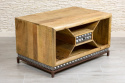 Indyjski, nowoczesny stolik w stylu loftowym, wykonany z niebarwionego mangowca indyjskiego - drewna o wysokich parametrach wytrzymałościowych. Naturalna struktura egzotycznego drewna w połączeniu ze stalowymi ozdobnikami, nadaje meblowi industrialnego charakteru.