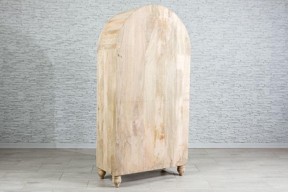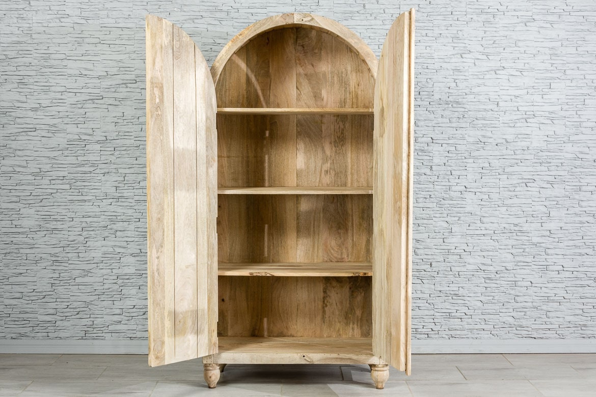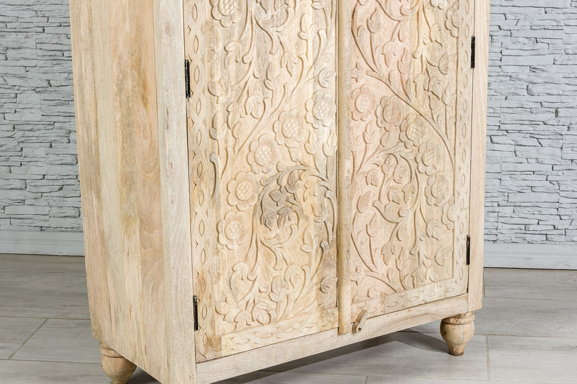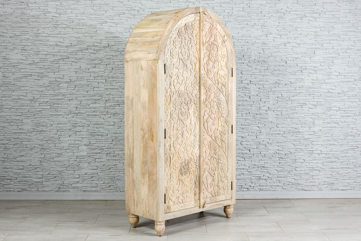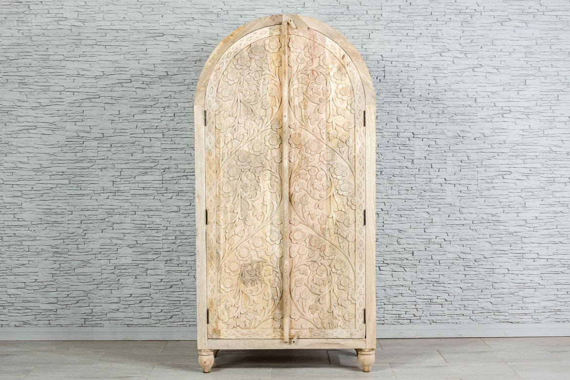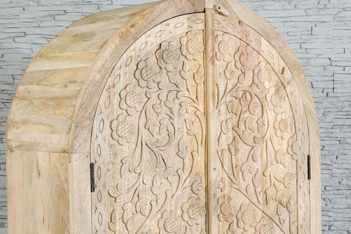 Piękna, łukowata szafa indyjska rzeźbiona w kwiaty i liście, wykonana z surowego drewna mango. Dzięki swojej nietuzinkowej stylistyce wprowadzi do Twojej aranżacji wyjątkowy klimat. Szczególnie polecamy do wnętrz orientalnych, kolonialnych i country. Szafa posiada wewnątrz półki.