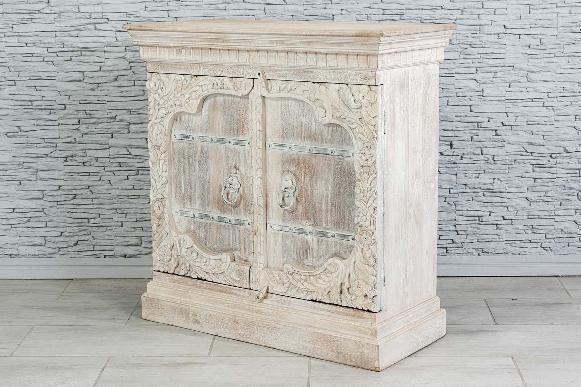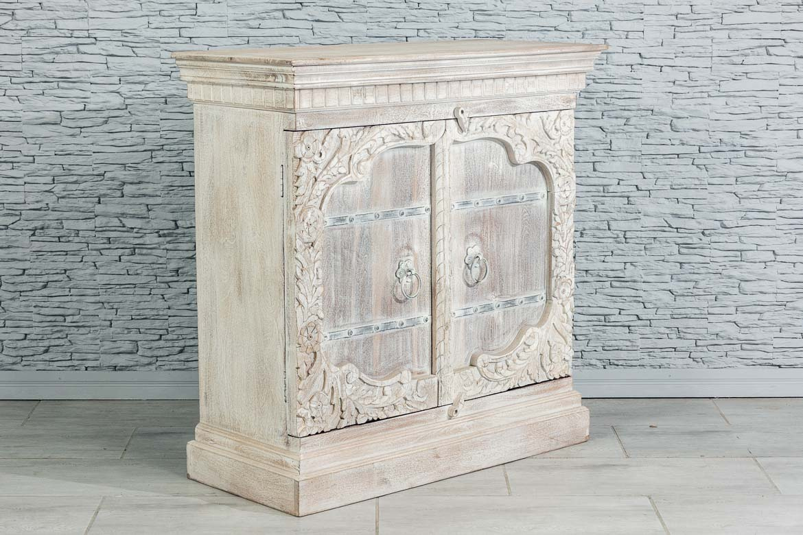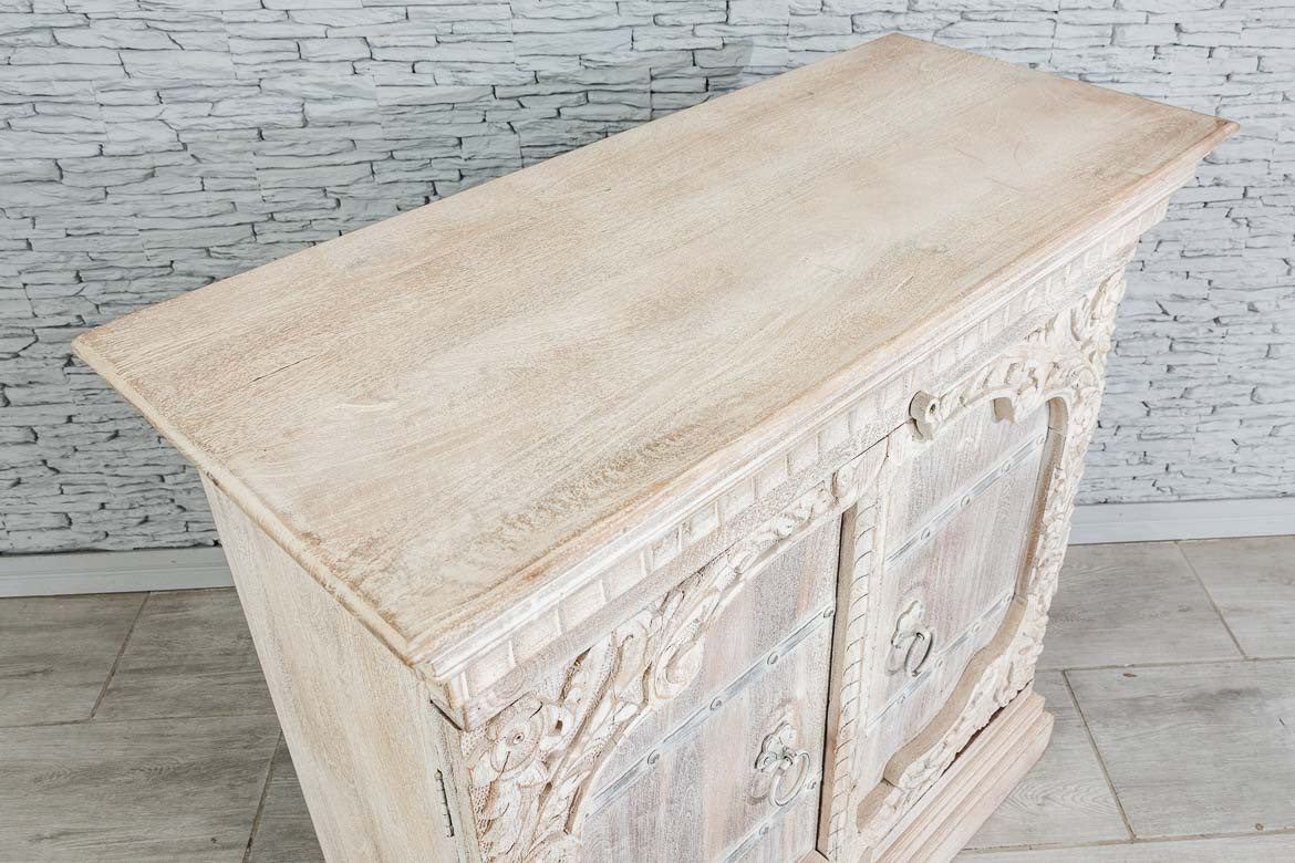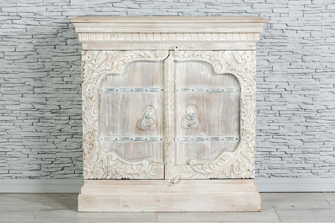 Biała komoda indyjska z piaskowanego drewna mango, wykonana ręcznie przez stolarzy - artystów. W dolnej części mebel wykończono dekoracyjnym cokołem, a w górnej eleganckim, frezowanym gzymsem. Fronty wyrzeźbiono dokoła florystycznym wzorem, a ich centralna część ozdobiona została żelaznymi okuciami. Komoda posiada duży schowek z półką. Mebel ponadczasowy stylistycznie i bardzo uniwersalny użytkowo. Sprawdzi się w każdym pomieszczeniu. Polecamy szczególnie do stylizacji orientalnych.