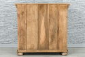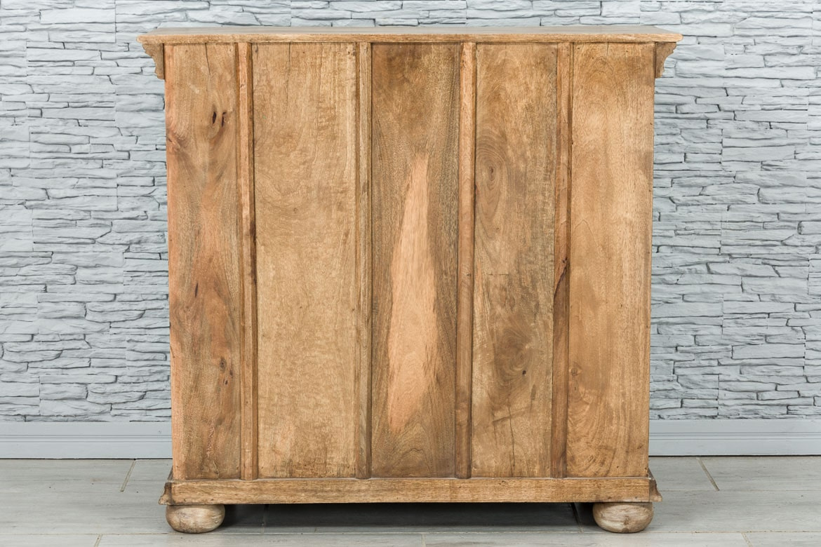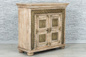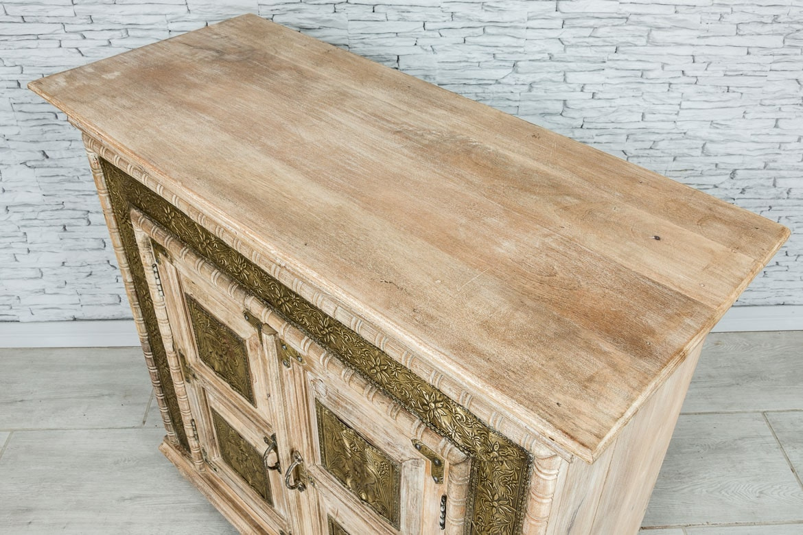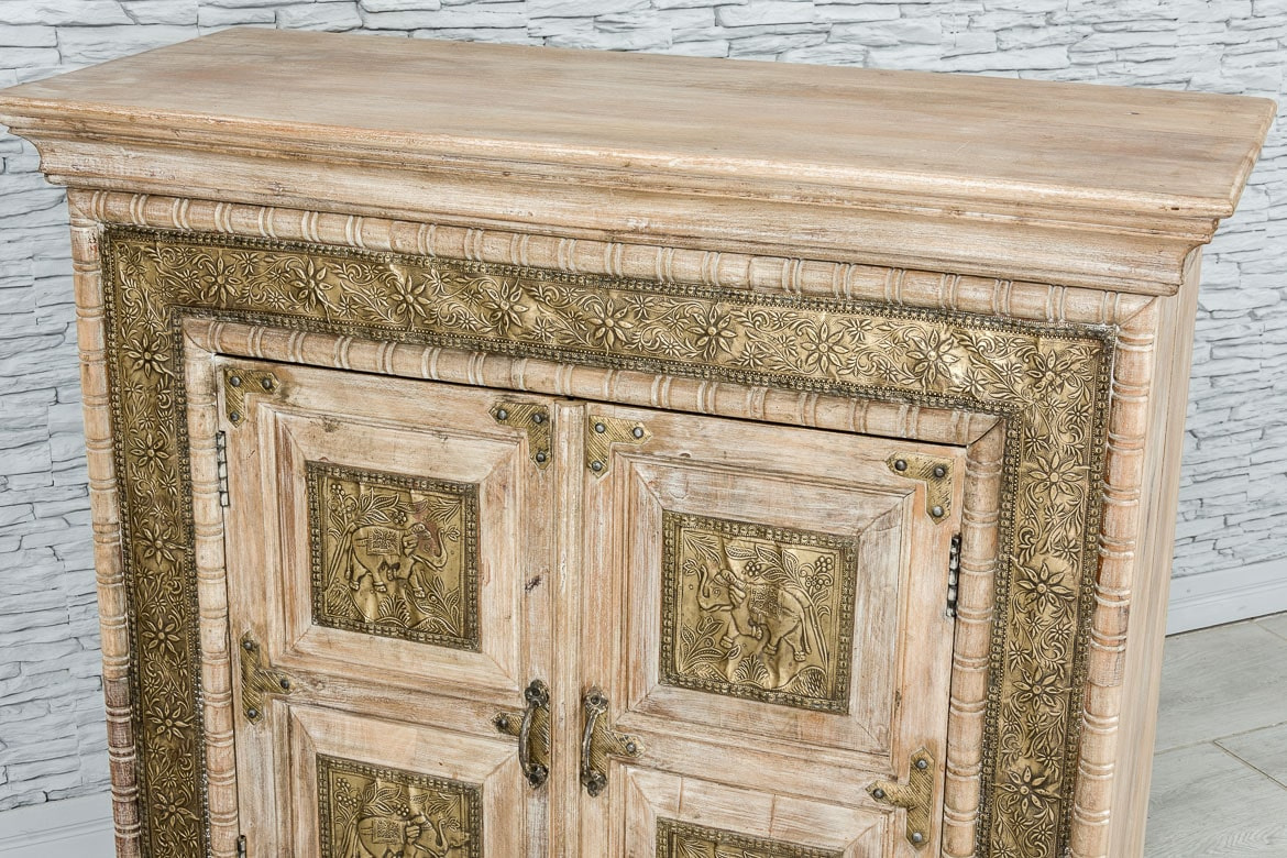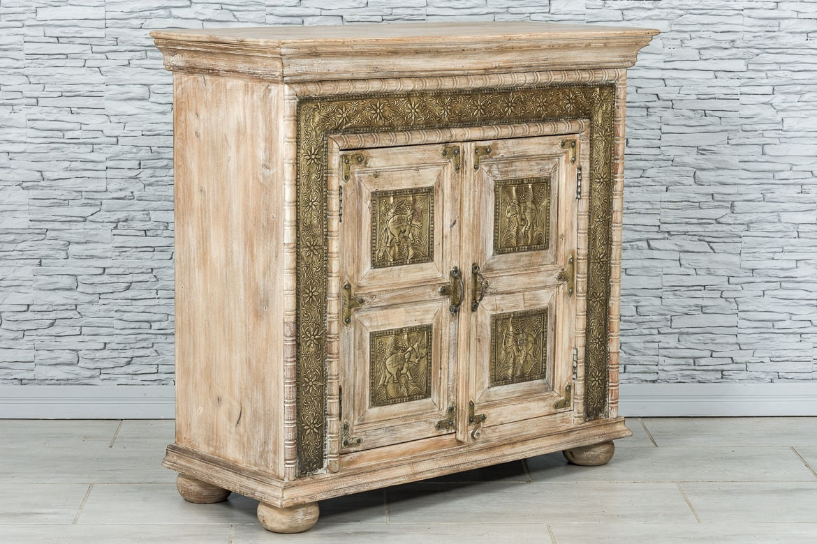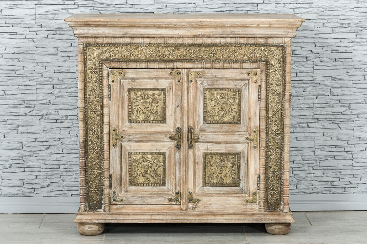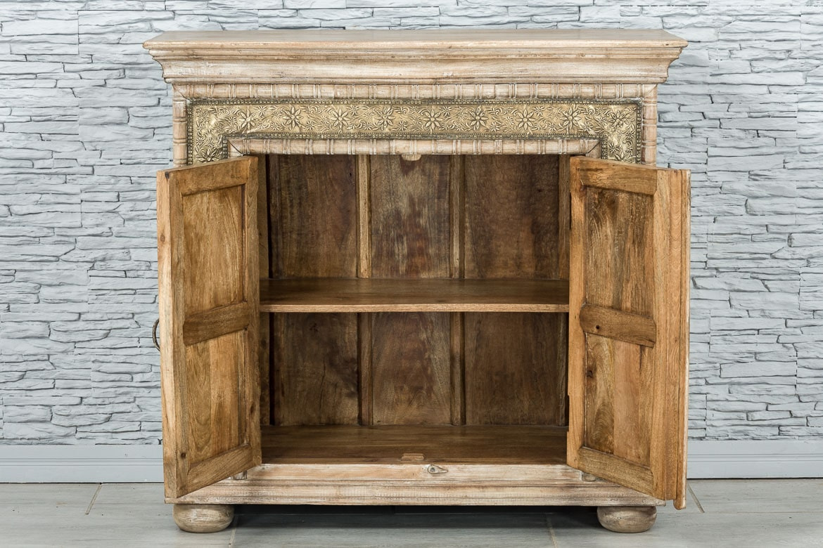 Mebel lekko bielony, wykończony stylowym gzymsem. Front ozdobiono przepięknymi, mosiężnymi dekorami w odcieniu antycznego złota. Komoda wykonana z litego drewna mango. Posiada wewnątrz jedną półkę. Mebel idealny zarówno do salonu, sypialni, łazienki czy przedpokoju. Wspaniale wkomponuje się w wiele stylizacji.