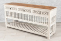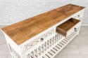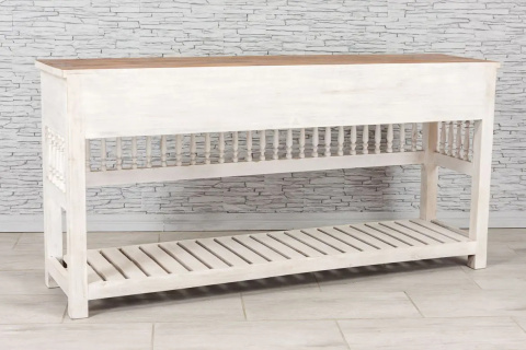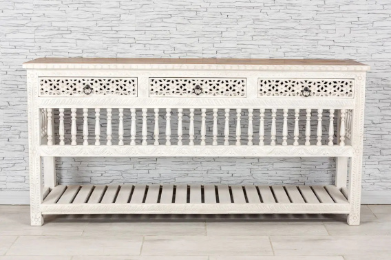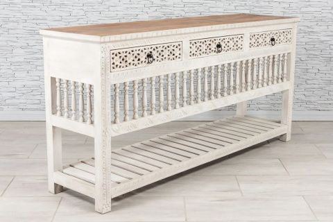 Biała, drewniana konsola indyjska z szufladami z ażurowo rzeźbionymi frontami oraz dolną półką.