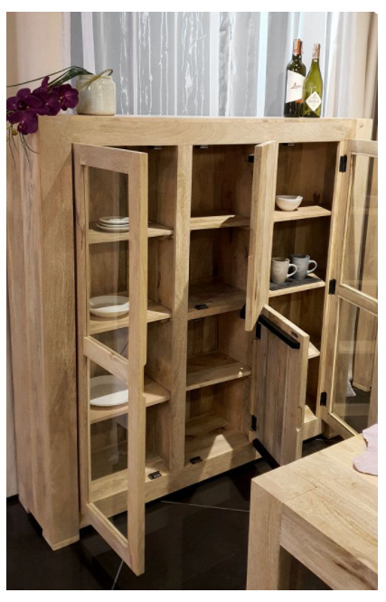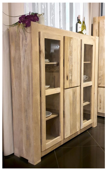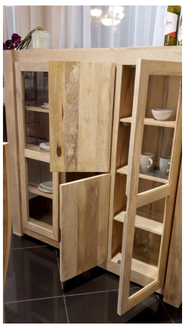 Witryna wykonana w Indiach z wysokiej jakości drewna mangowca w kolorze naturalnym, pokryta matowym ekologicznym lakierem wodnym. Witryna może służyć jako mebel wolnostojący lub jako nadstawka. Dzięki odkręcanym nóżkom możesz ją bezpiecznie postawić na meblu i stworzyć zjawiskową całość.
