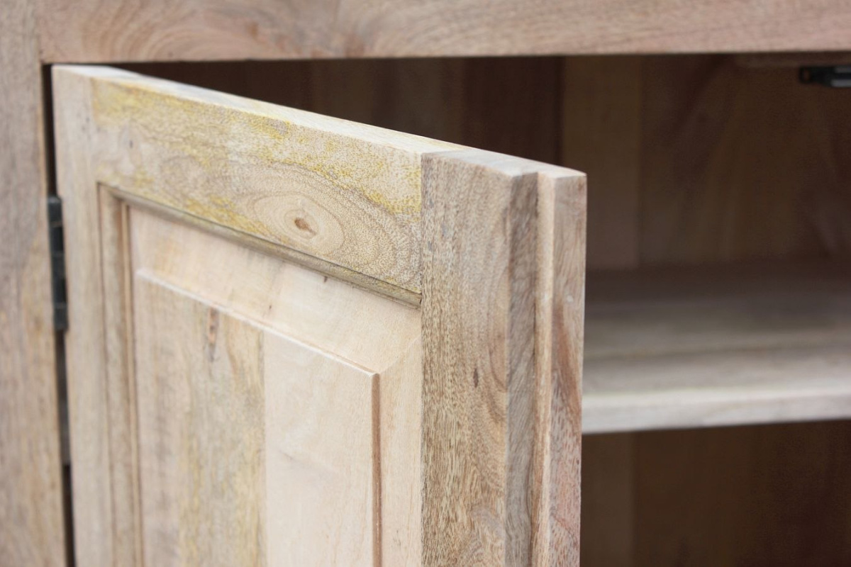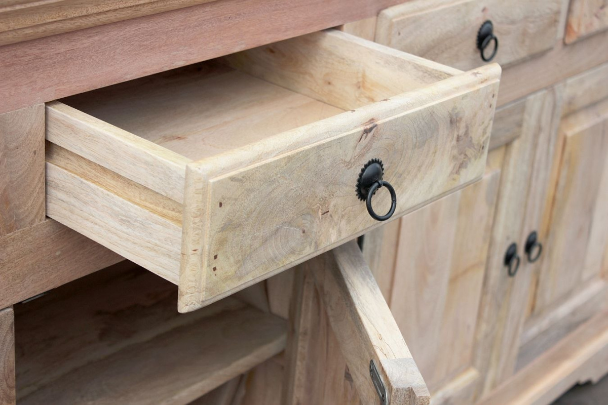 To jasne, naturalne biurko posiada szufladę oraz szafkę z dekoracyjnymi uchwytami. Mebel wykonany został z wysokiej jakości drewna mango w naturalnym kolorze. Powierzchnia lakierowana z widoczną strukturą słoi, co pozwala dostrzec piękno egzotycznego drewna. Biurko łączy w sobie funkcjonalność i dobry styl.