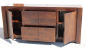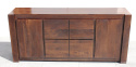 Komoda posiada dwie głębokie szuflady oraz dwie szafki z półkami. Drzwiczki i szuflady otwiera się przy pomocy wyżłobionych po bokach frontów uchwytów. Komoda wykonana w całości z litego, jednego gatunku drewna (ronty, blaty, konstrukcja, dna szuflad i plecy mebla).