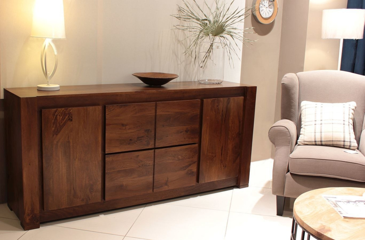 Stylowa, kolonialna komoda drewniana o prostym, nowoczesnym kształcie.