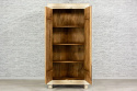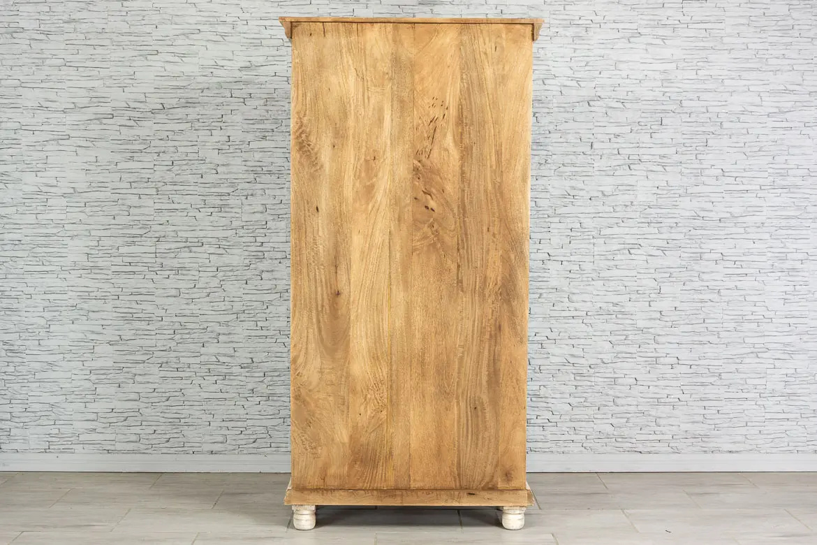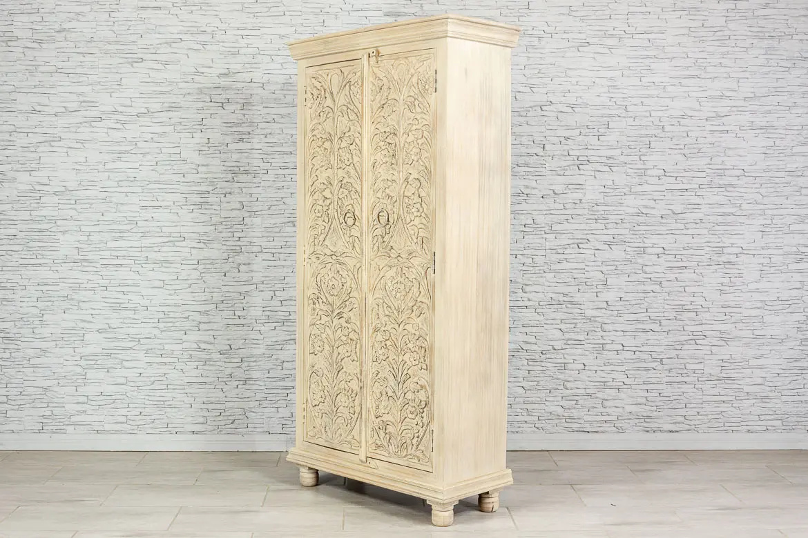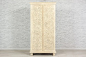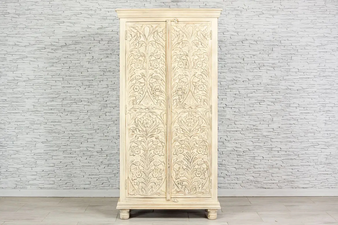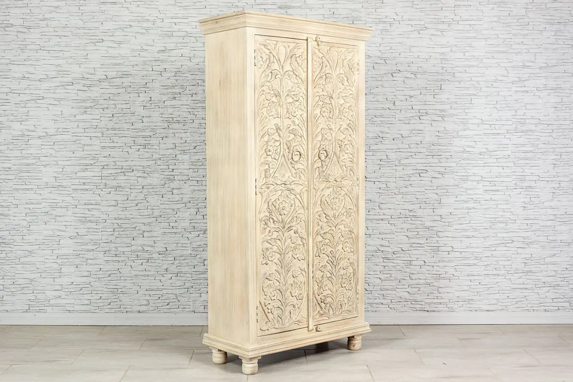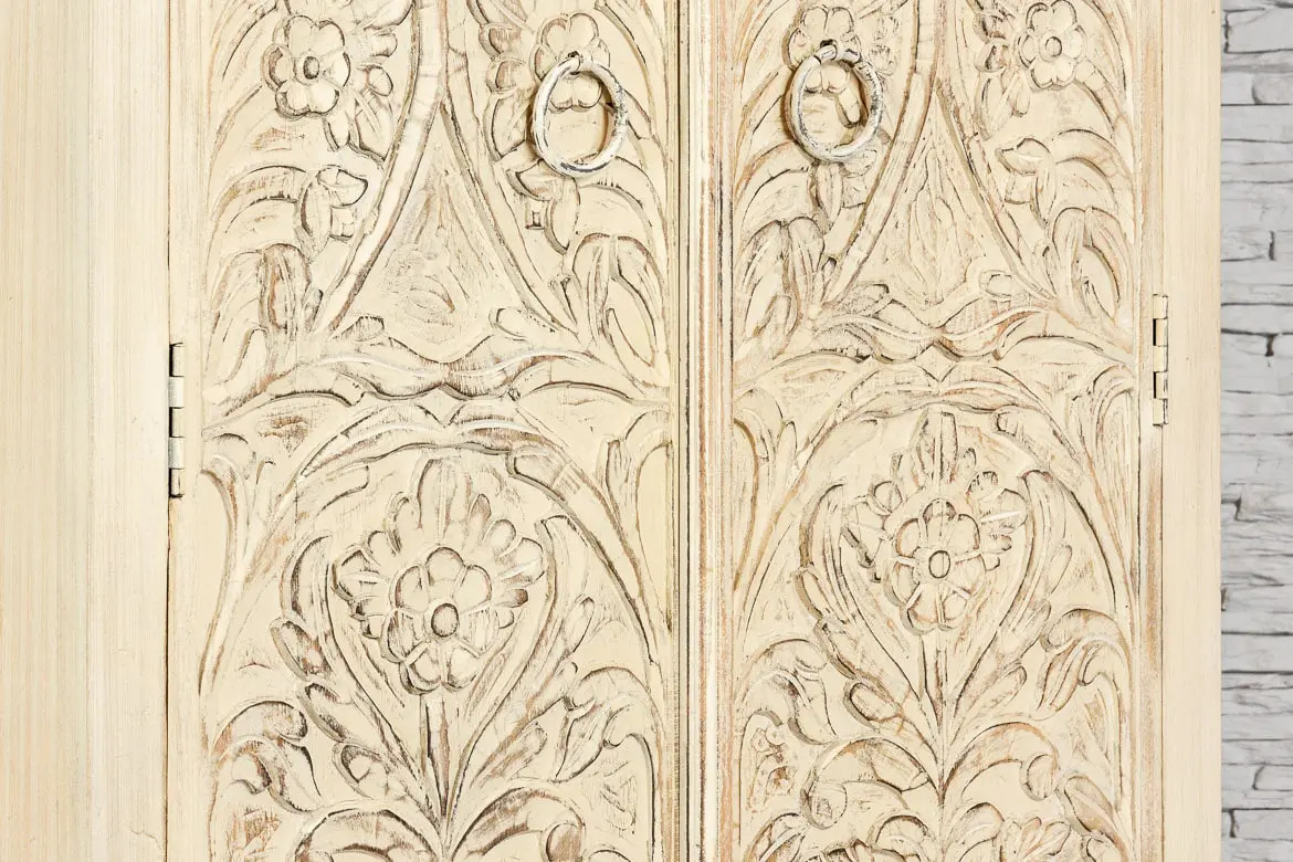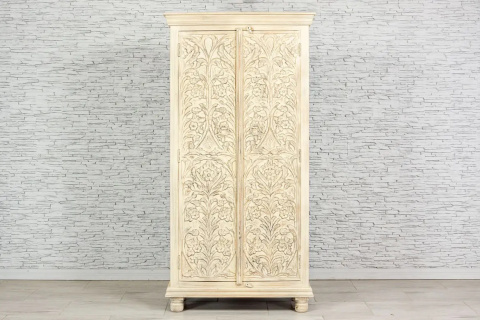 Pastelowa szafa dwudrzwiowa z ozdobnymi frontami. Ten wyjątkowy mebel został wykonany ręcznie przez indyjskich rzemieślników z wysokiej jakości surowca jakim jest drewno mango. Szafa malowana na odcień morelowy i przecierana, z wyrzeźbionym na drzwiach kwiatami.