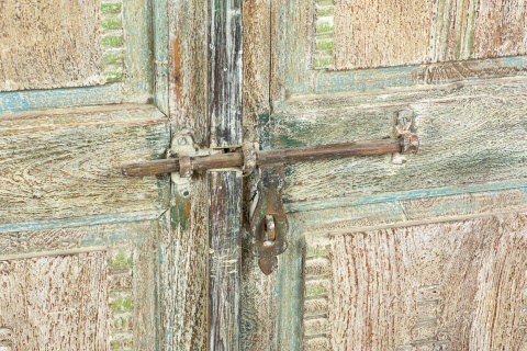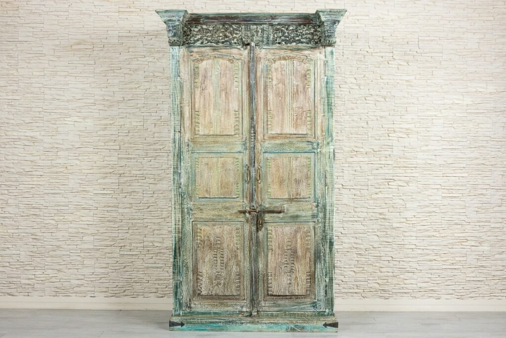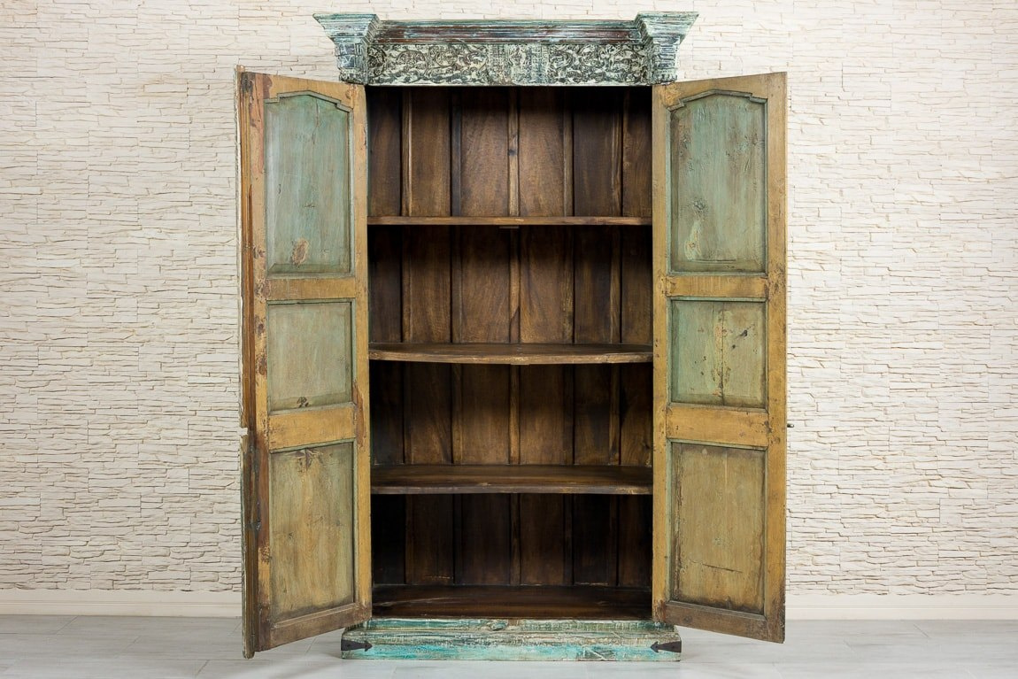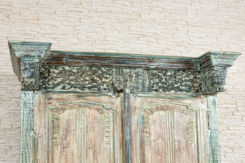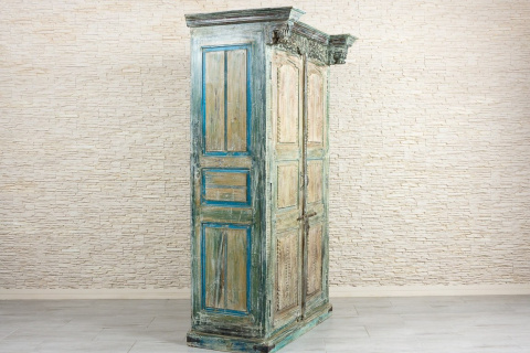 Powierzchnia szafy została specjalnie postarzona i przetarta, dzięki czemu spod kolejnych warstw wyłaniają się niebieskości, turkusy i zielenie. Szafa ze starymi, oryginalnymi indyjskimi drzwiami, posiadają ozdobny skobel, który nadaje meblowi charakteru vintage. Mebel odnajdzie się w każdym pomieszczeniu. Polecamy do przestronnych, wysokich wnętrz. Wewnątrz szafy znajdują się pojemne półki.