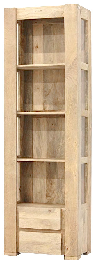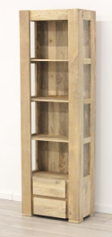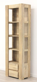 Wąski regał z przeszkleniem z szufladami z jasnego drewna mango.