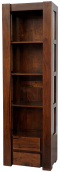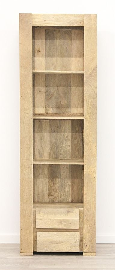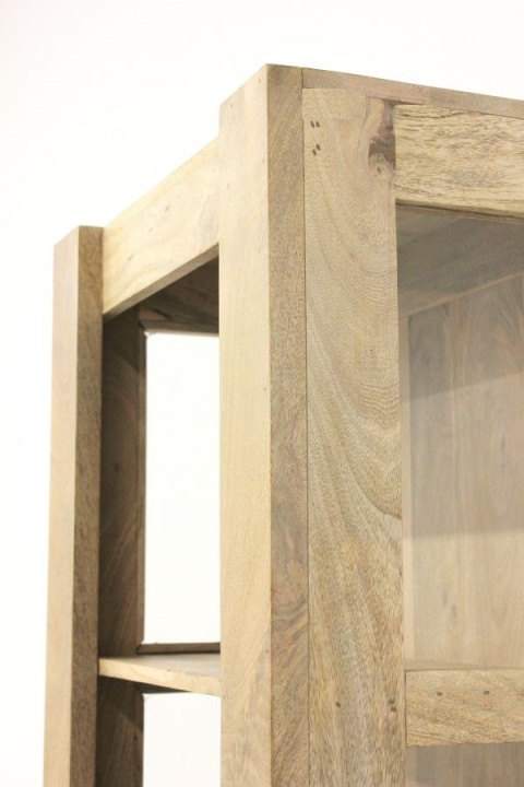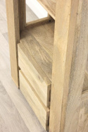 Drewno zostało pozostawione w swoim naturalnym odcieniu i zabezpieczone bezbarwnym, ekologicznym lakierem wodnym. Ten wysoki regał został w całości wykonany z litego jednego gatunku drewna (fronty, blaty, konstrukcja, dna szuflad i plecy). Mebel posiada dwie szuflady, cztery otwarte półki oraz przeszklone boczne ścianki.