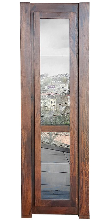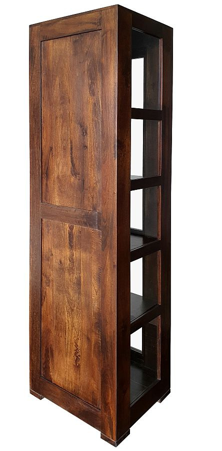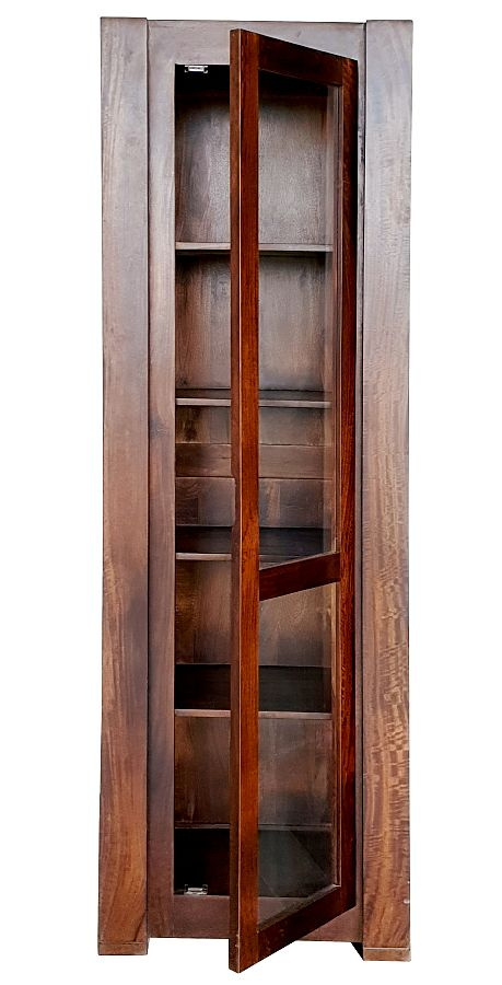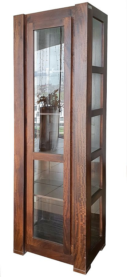 Wysoka witryna, wykonana z drewna mango w kolorze ciepłego brązu.