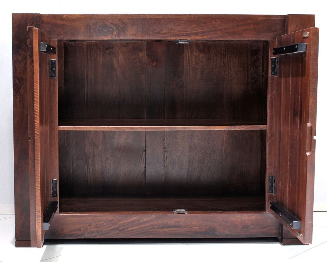 Ten wyjątkowy mebel został wykonany w Indiach z wysokiej jakości litego drewna mango, w odcieniu ciepłego brązu. Faktura egzotycznego drewna sprawia, że mimo swojej prostej formy, jest bardzo oryginalny. Komoda wykonana w całości z litego drewna oraz wykończona lakierem satynowym.
