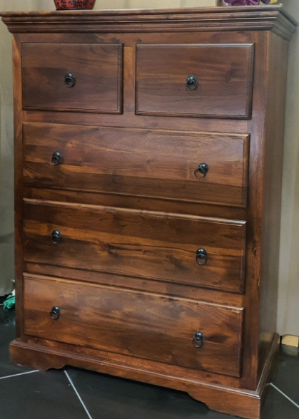Meble indyjskie — brązowa komoda drewniana z szufladami do sypialni.