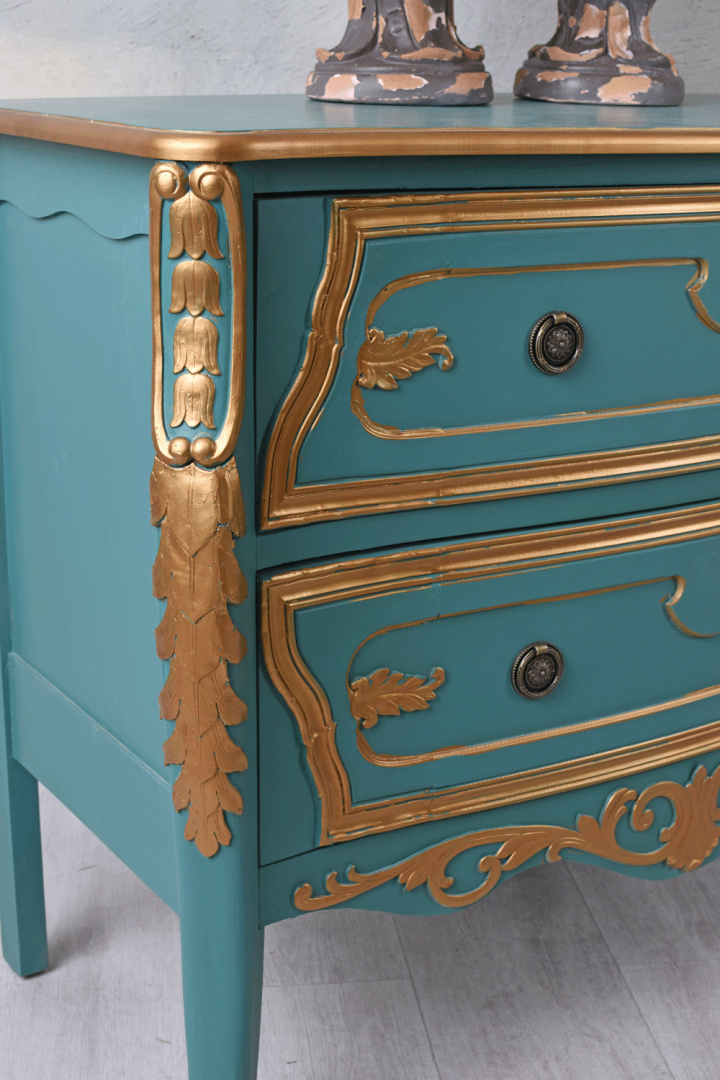Mebel wygląda jak ze starego dworku lub pałacyku. Intensywny odcień i złote wykończenie, idealnie korespondują z wyrafinowanym kształtem mebla i eleganckimi uchwytami, które dopełniają tą wysmakowaną całość i dodają komodzie niezwykłego uroku.