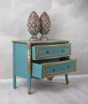 Niebieska komoda drewniana z szufladami, inspirowana dawnymi czasami.