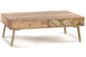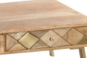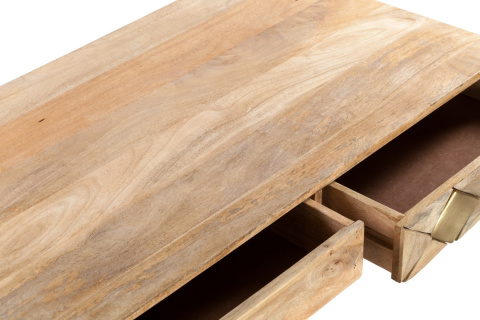 Prostokątny stolik kawowy marki ALURO, wykonany z połączenia drewna, mosiądzu i żelaza, mebel oryginalny, unikatowy, ręcznie wyprodukowany w manufakturze indyjskiej. Model ARATI, to mebel utrzymany w naturalnej strukturze i kolorze drewna mango. Elementem ozdobnym, umieszczonym we frontowej części jest drewniana mozaika oraz wstawki z platerowanego mosiądzu. Stolik posiada dwie szufladki z ozdobnymi uchwytami. Blat oparty został na metalowych nogach w kolorze antycznego mosiądzu,. Ten oryginalny stolik kawowy nada Twojemu wnętrzu stylu i oryginalnego charakteru.