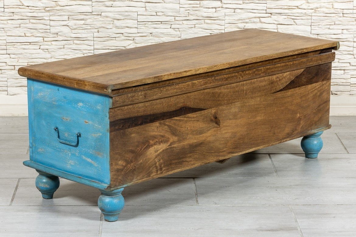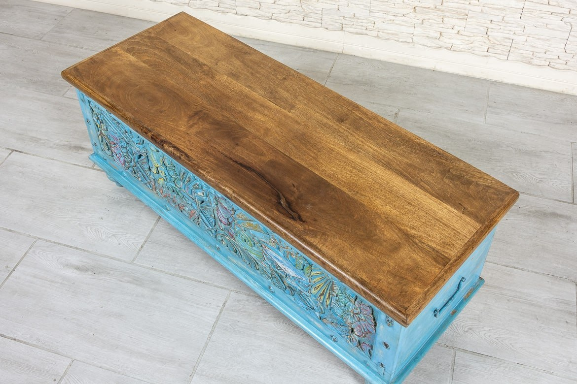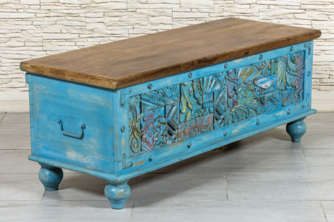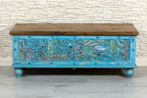 Wyjątkowy drewniany niebieski kufer indyjski, z bogato zdobionym frontem, wykonany ręcznie z drewna mango. Może służyć jako siedzisko lub schowek. Skrzynia posiada masywną, solidną konstrukcję., jest więc trwała i odporna na zniszczenia. Wieko w pięknym, naturalnym kolorze drewna zestawiono z intensywnym odcieniem niebieskości. Na florystycznych rzeźbieniach przebijają wszystkie kolory tęczy. Całość delikatnie postarzona i przecierana. Skrzynia odnajdzie się w przedpokoju, a także salonie czy sypialni.