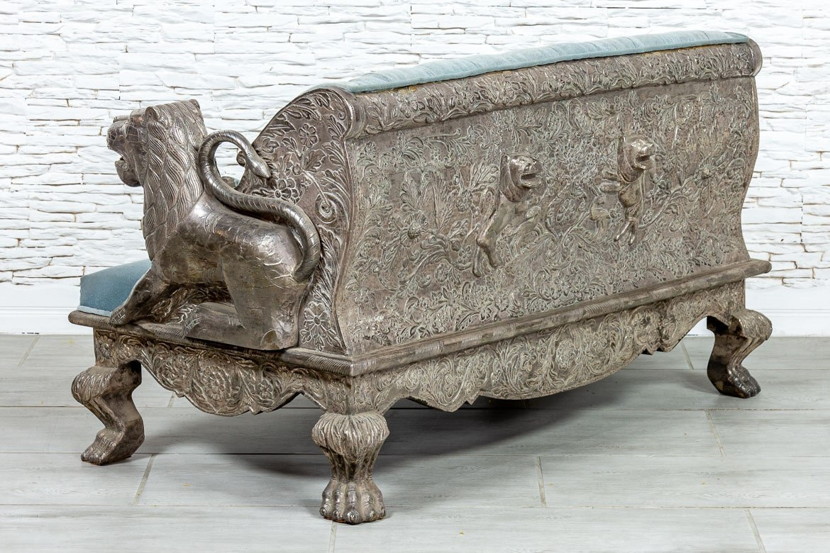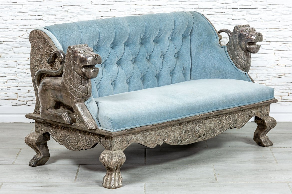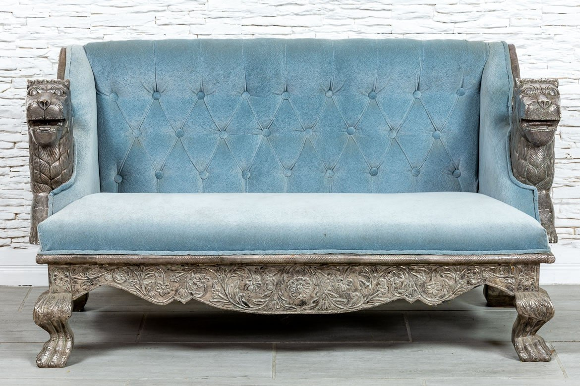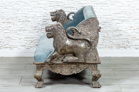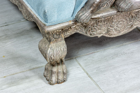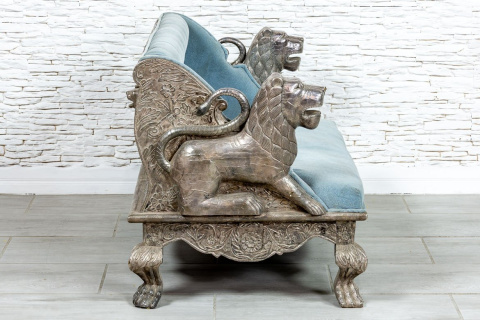 Luksusowa mini sofa indyjska, wykonana ręcznie w małej manufakturze. Zbudowana na masywnym, tekowym stelażu i pokryta srebrną blachą próby 900+, srebro jest naturalnie spatynowane. Kształtem i stylem nawiązuje do mebli antycznych. Usytuowana na lwich nogach i ozdobiona dwoma lwami po bokach. Całość bogato rzeźbiona, niezwykle strojna i wytworna. Ciężki charakter mebla zmiękcza przepiękny odcień bladego błękitu. Tapicerkę wykonano z wysokiej jakości weluru, a plecy przepikowano, co dodaje meblowi jeszcze więcej elegancji.