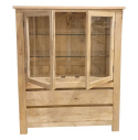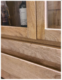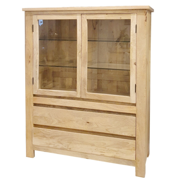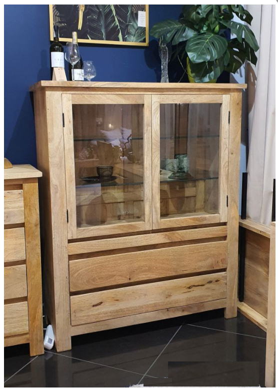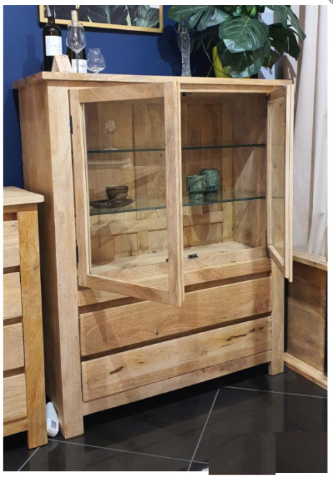 Wykonana w małej manufakturze w Indiach, przez miejscowych rzemieślników. Do produkcji tego masywnego i eleganckiego mebla, użyto wysokiej jakości litego drewna mango w naturalnym odcieniu. W górnej części witryna posiada szklane półki, a w dolnej dwie szuflady. Przeszklenie dodaje meblowi lekkości i klasy. Korpus usytuowany jest na niskich, drewnianych nóżkach.