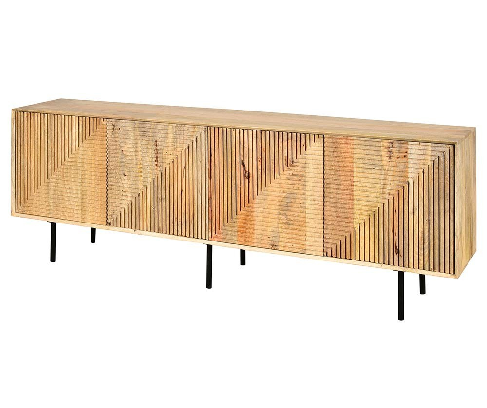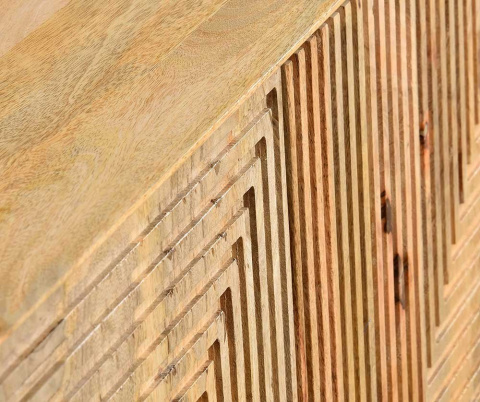 Szeroka, nowoczesna komoda drewniana z serii MODERN LIGHT od Belldeco. Mebel stylizowany na lata 60-te. Potężna, minimalistyczna bryła z pojemnymi schowkami, urozmaicona została wypukłą, geometryczną fakturą na frontach. Charakterystyczne, smukłe nóżki nadają jej lekkości.