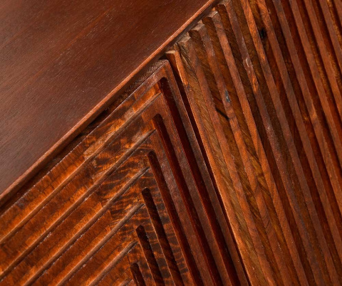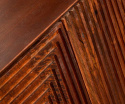Szeroka, nowoczesna komoda drewniana z serii MODERN DARK od Belldeco. Mebel stylizowany na lata 60-te. Potężna, minimalistyczna bryła z pojemnymi schowkami, urozmaicona została wypukłą, geometryczną fakturą na frontach. Charakterystyczne, smukłe nóżki nadają jej lekkości.