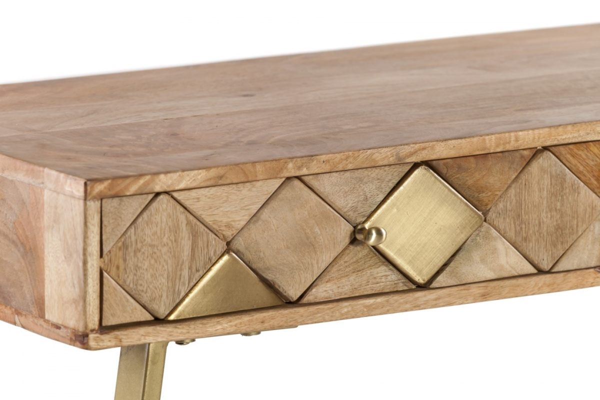 Konsola ARATI marki ALURO, to mebel wykonany z drewna mango, utrzymanego w naturalnej strukturze i kolorze. Elementem ozdobnym,umieszczonym we frontowej części, są kawałki drewna połączone w mozaikę, oraz wstawki z platerowanego mosiądzu. Konsola została wsparta na metalowych nogach w kolorze antycznego mosiądzu.