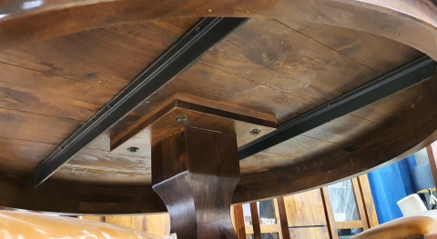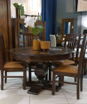 Okrągły, brązowy stół drewniany na grubej ozdobnej nodze.