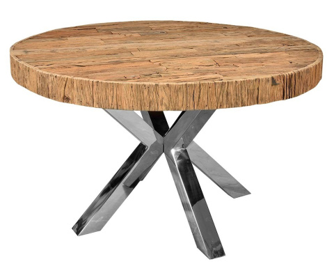Okrągły, potężny stół z kolekcji LONDON od Belldeco, wykonany z drewna podkładowego recyklingowego i stali nierdzewnej. Stół posiada masywny, połyskujący stelaż, który przepięknie kontrastuje ze szczotkowanym, porowatym blatem.