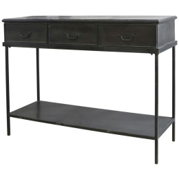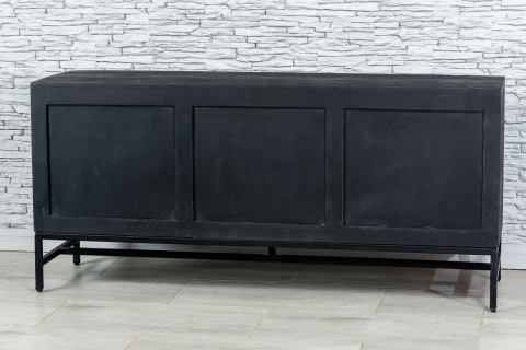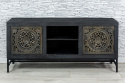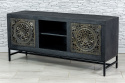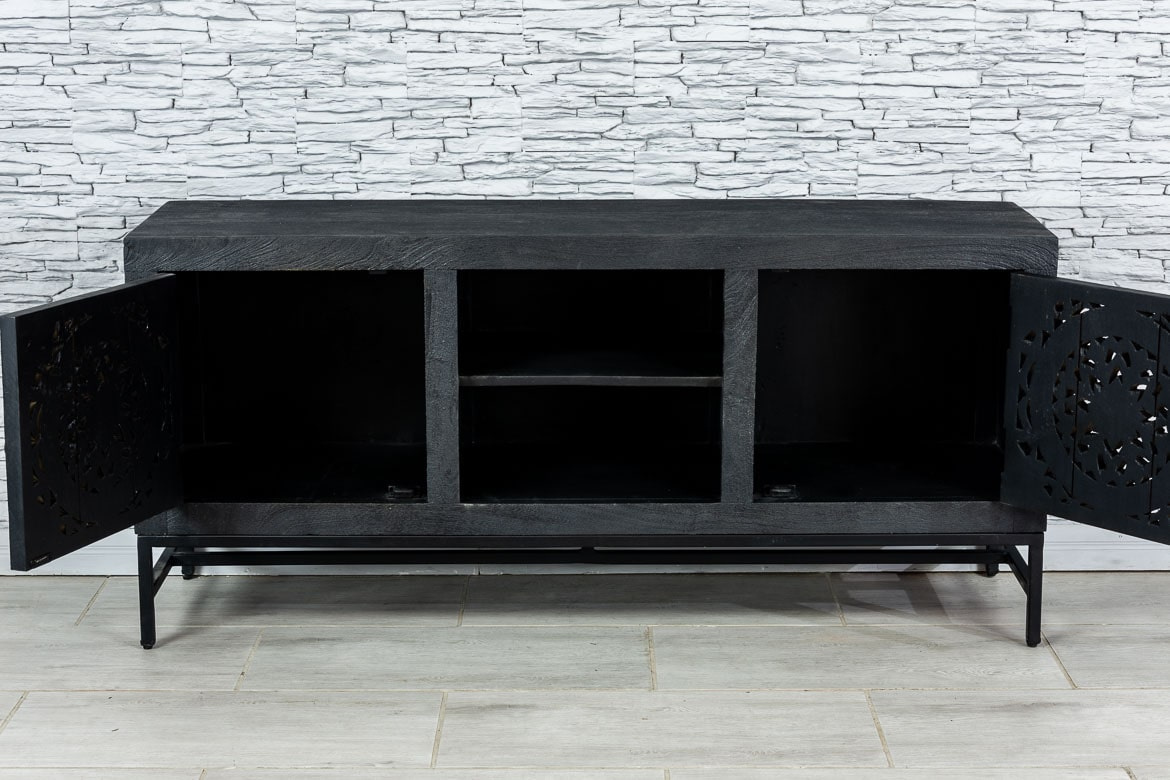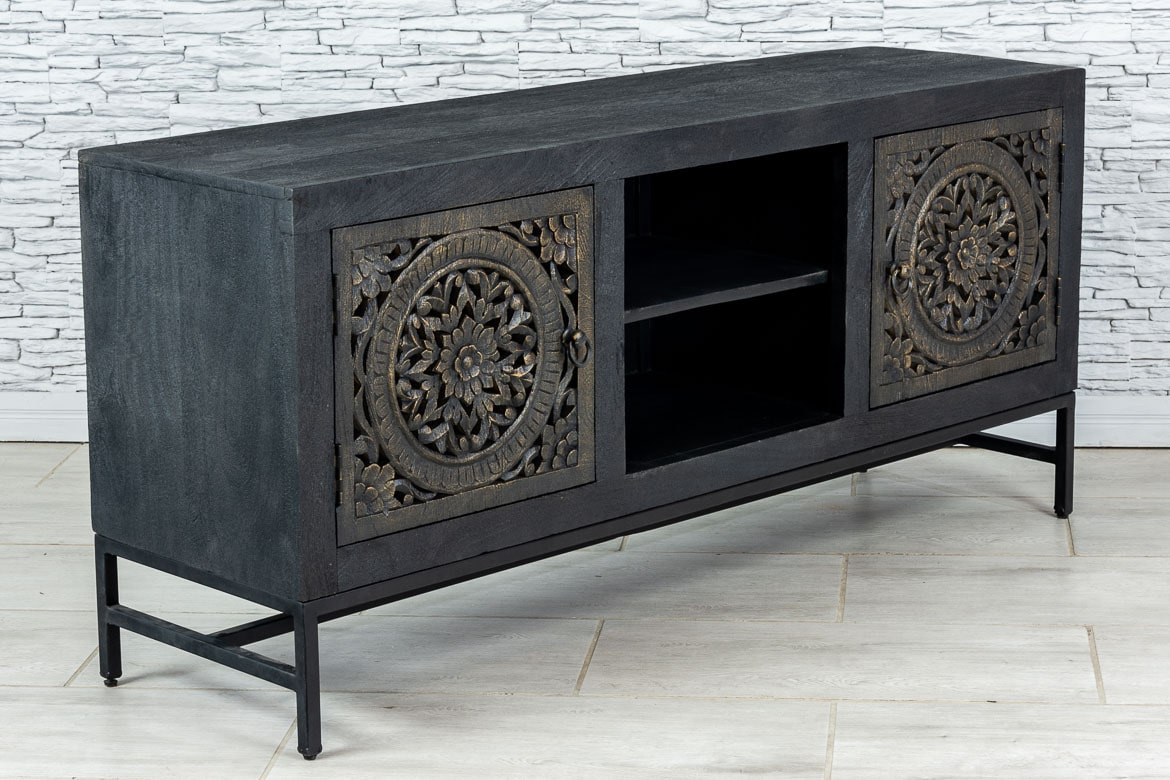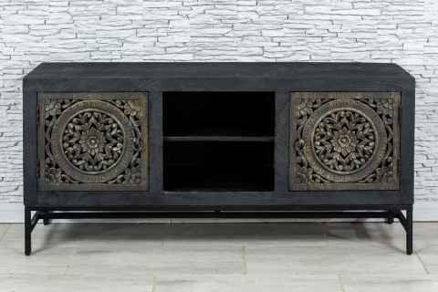 Indyjska, czarna szafka RTV na metalowych nóżkach w stylu orientalnym.