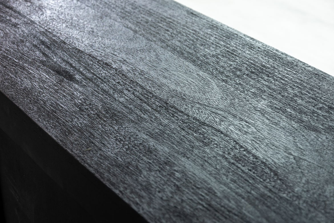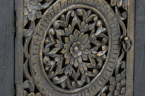 Komodę wykonano w małej, indyjskiej manufakturze z egzotycznego drewna mango. Powierzchnia drewna została wypiaskowana tworząc efekt otwartych słojów. Orientalny ażurowy front z przepiękną mandalą idealnie pasuje do matowej czerni przeplatającej się ze złotem. Korpus usytuowany na żelaznych profilach Szafka posiada dwa zamykane schowki i jeden otwarty z półką. Polecamy również inne meble w tym wykończeniu dostępne w naszym sklepie.