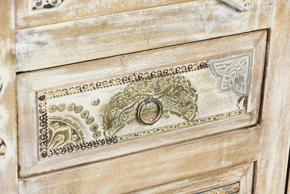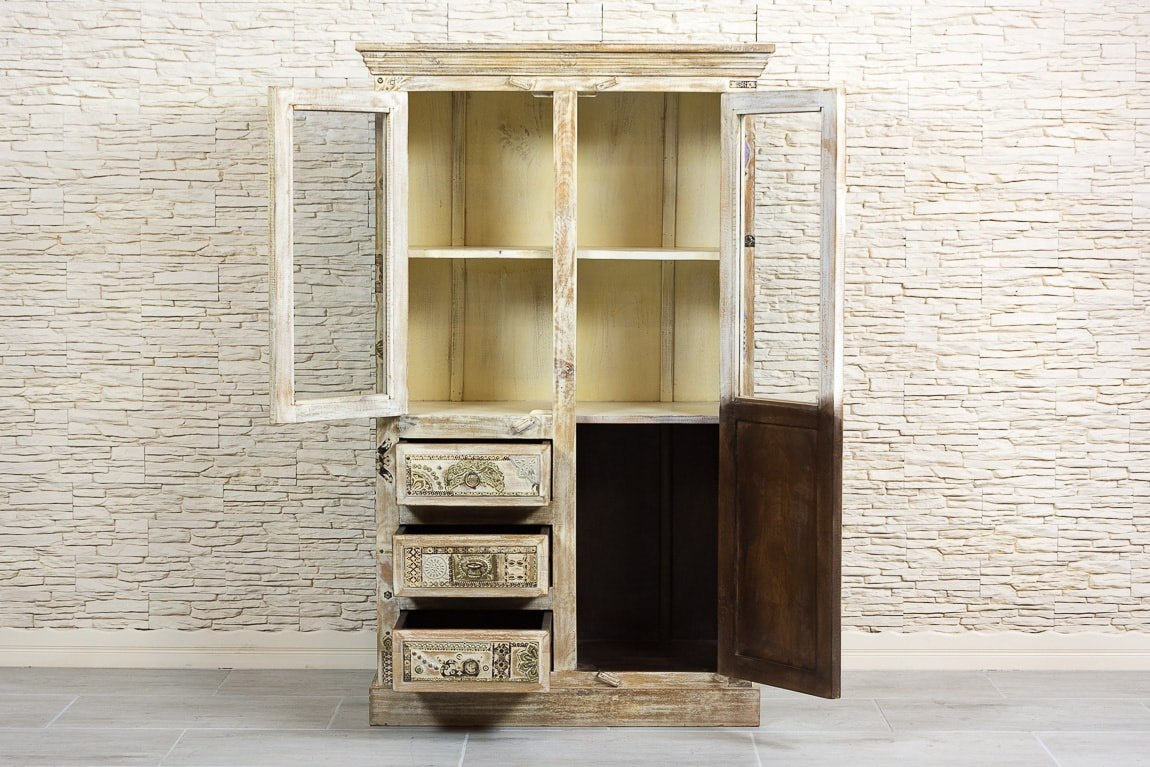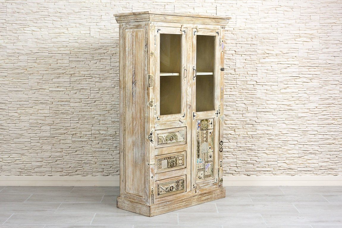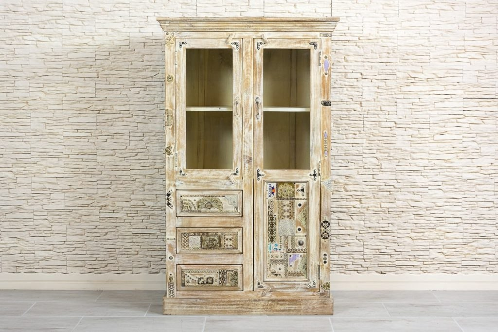 Stylowa, drewniana przeszklona witryna, wykonana z pięknego i odpornego na zniszczenia drewna mango. Witryna o bogato zdobionych frontach, które zachwycają wysmakowanymi detalami i kipią orientem. Metalowe ozdobniki o różnych fakturach i kształtach, w połączeniu z oryginalnymi uchwytami, dają niesamowitą całość. Mebel posiada trzy szuflady, schowek i pojemną przeszkloną szafkę z półką.