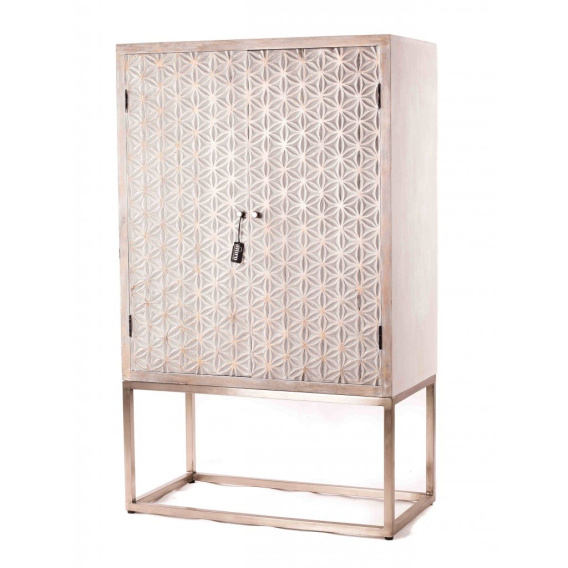 Wysoka drewniana komoda na metalowych nogach marki ALURO. Ta indyjska szafka drewniana na metalowym stelażu, to połączenie stylu orientalnego z nowoczesnym.