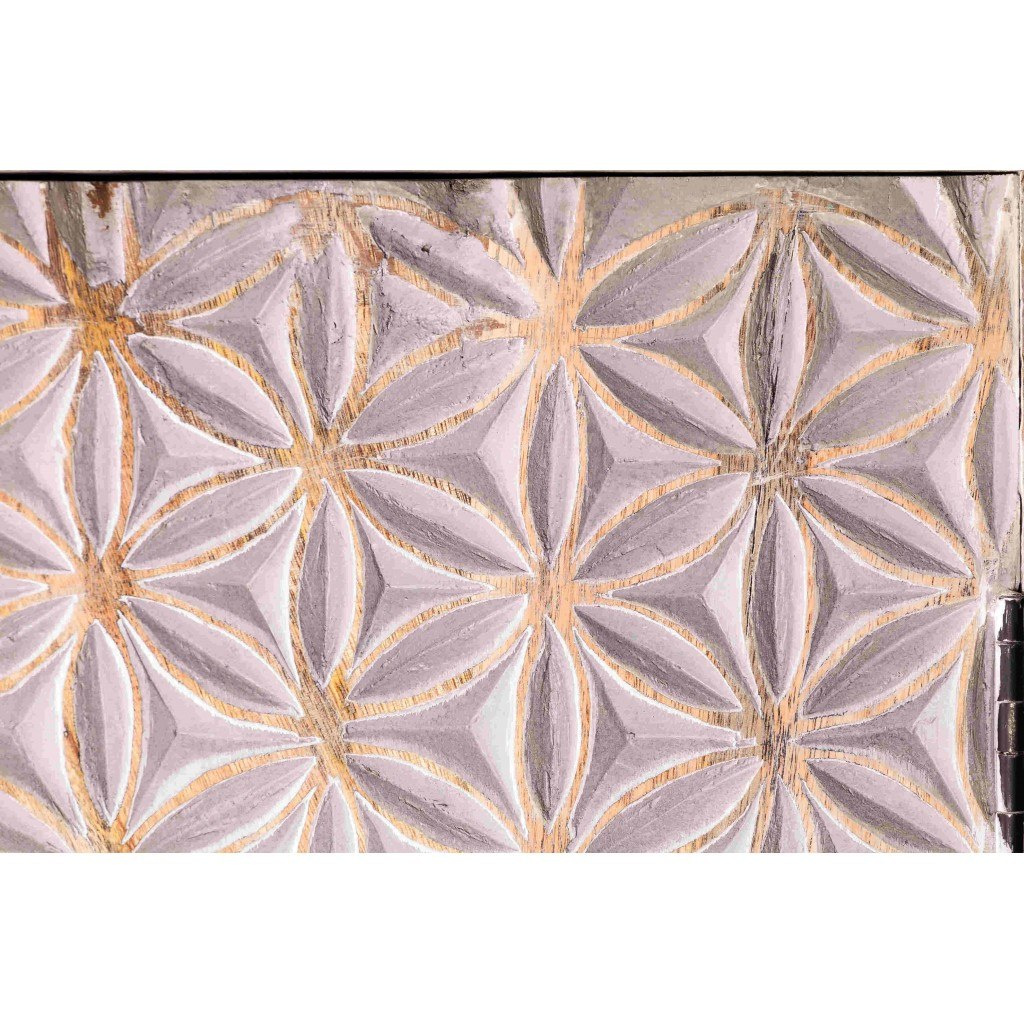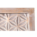 Góra wykonana z drewna mango, Fronty ozdobiono ręcznie motywem roślinnym i pomalowano na odcień szarości z przetarciami. Dzięki temu zabiegowi, komoda zyskała rustykalny charakter.