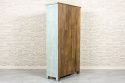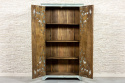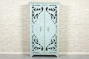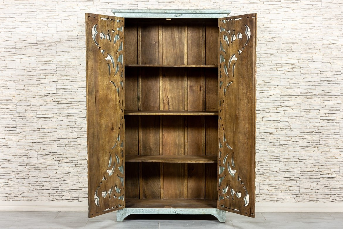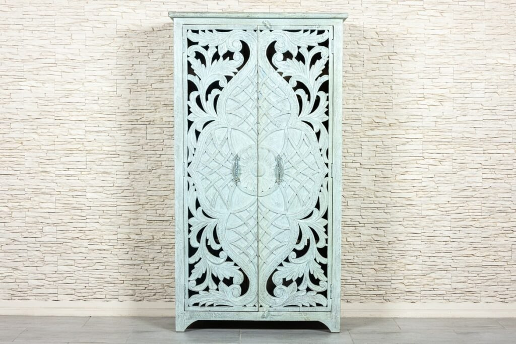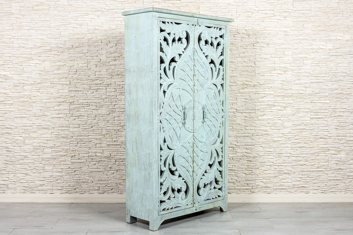 Drewniana szafa indyjska z ozdobnymi, ażurowymi frontami, na których wyrzeźbiono zjawiskowe, florystyczne wzory. Ten mebel został wykonany ręcznie w Indiach w małej manufakturze. Do jego produkcji użyto drewna mango, które wypiaskowano i pomalowano na odcień bladej mięty wpadającej w pistację. Dzięki temu szafa ma ciekawą fakturę, która pięknie komponuje się z delikatnymi przetarciami. Oprócz walorów estetycznych szafa jest również bardzo praktyczna. Posiada aż 4 pojemne półki.