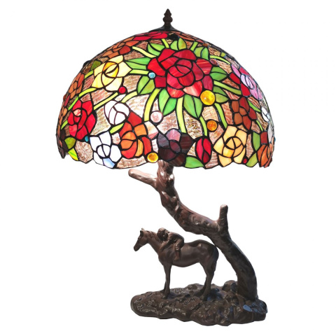 Ciekawy kształt klosza z przepiękną mozaiką z kolorowych szkiełek, zachwyca wzorem i grą barw. Lampa zmienia kolory w zależności od rodzaju i nasycenia oświetlenia. Oryginalna podstawa lampy - dziecko na koniu pod drzewem. Ten model ozdobi Twój stół, komodę czy też konsolę.