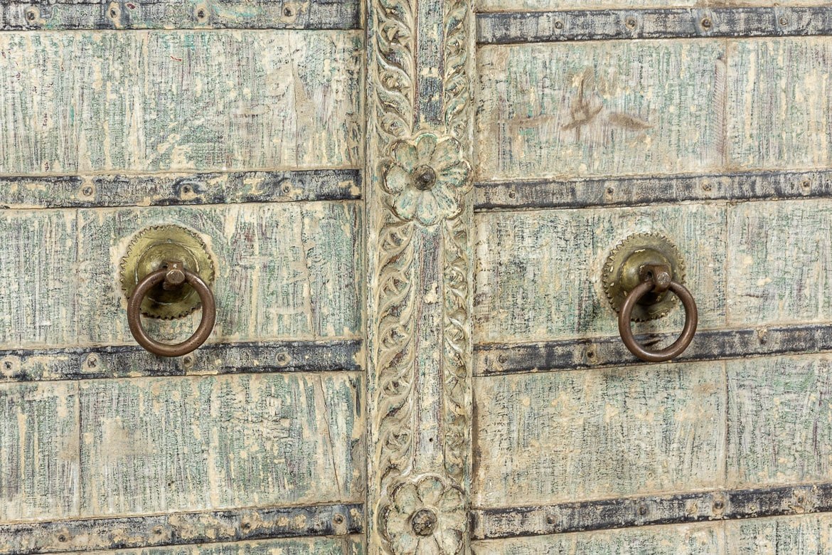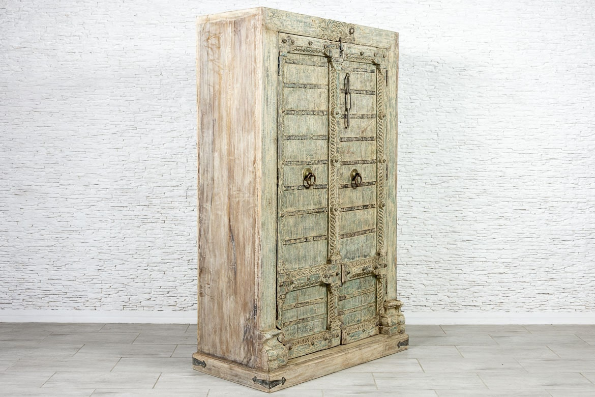 Duża masywna szafa indyjska w stylu antycznym. Wykonano ją w małej manufakturze indyjskiej, z litego drewna tekowego i mango. Stare, antyczne ozdobne fronty o nierównej fakturze, zachwycają ręcznym rzeźbieniem i niezwykłym odcieniem antycznego beżu wpadającego w szarość. Mebel przecierany i delikatnie postarzony. Rustykalne okucia i mosiężne dodatki są wspaniałym dopełnieniem wysmakowanej całości.