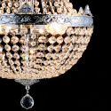 Stylowy żyrandol ze szklanych kryształków, które umieszczono na ozdobnym, żelaznym stelażu.