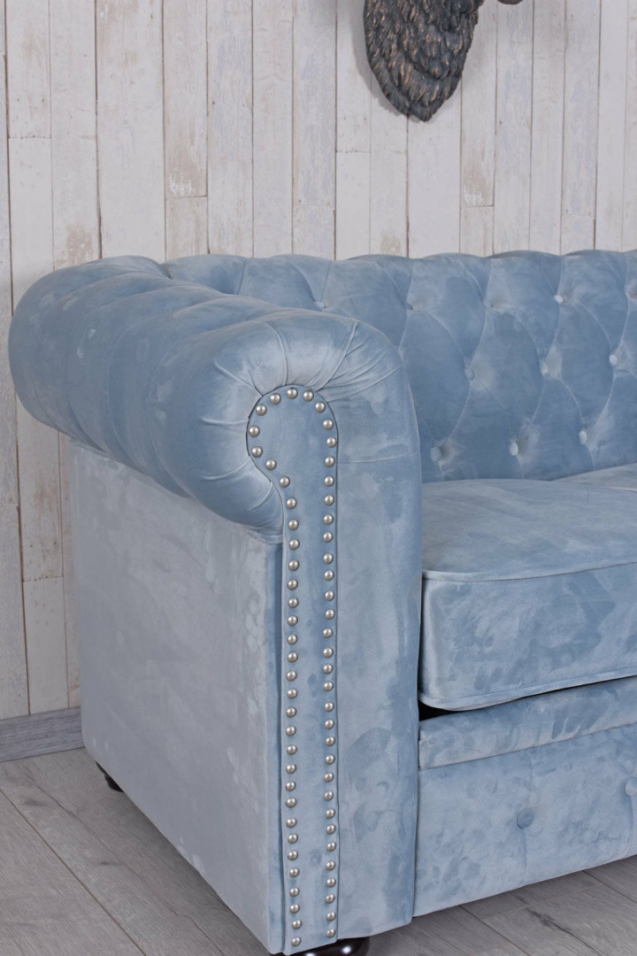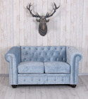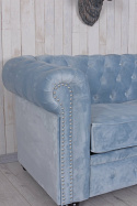 Elegancka, niebieska sofa dwuosobowa Chesterfield.