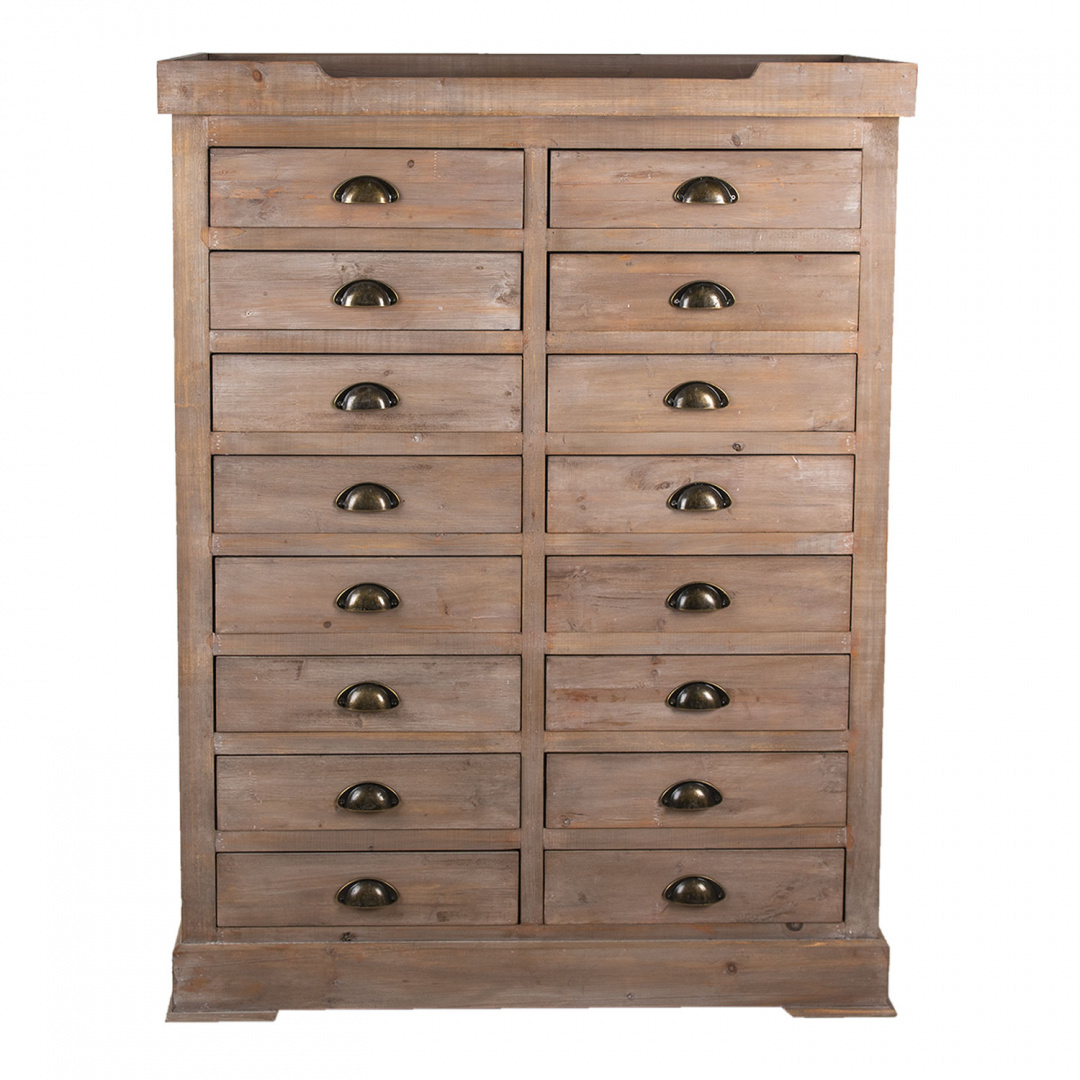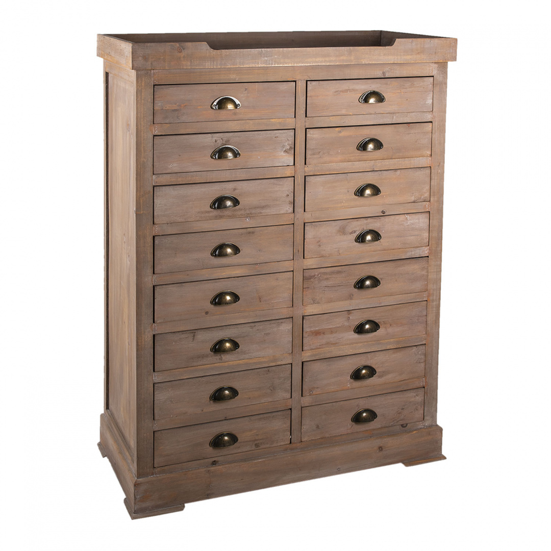 Podwójna, brązowa komoda drewniana z szufladami marki Clayre & Eef, która zadbała o dobry, ponadczasowy design i praktyczność w jednym. Mebel wykonano z litego drewna i wykończono w klasycznym stylu, inspirowanym dawnymi epokami. Mebel jest delikatnie postarzony. Metalowe uchwyty dodają mu charakteru vintage. Posiada aż szesnaście praktycznych szuflad, które pozwolą Ci na segregację wielu drobnych przedmiotów.