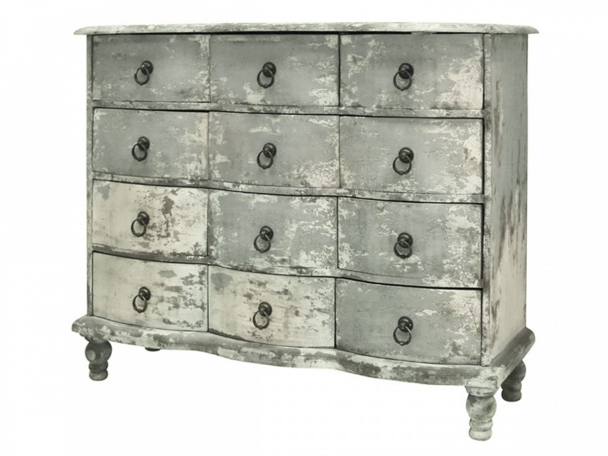 Postarzana drewniana komoda z szufladami marki Chic Antique. Ta piękna komoda na ozdobnych nóżkach, to mebel stworzony do wysmakowanych wnętrz rustykalnych. Swój wyjątkowy wygląd zawdzięcza efektowi postarzenia. Bruzdy, odpryski i przecierki, sprawiają, że wygląda jak z zabytkowego domu. Komoda posiada dwanaście szuflad z uchwytami w stylu retro. Mebel sprawdzi się w każdym pomieszczeniu. Ozdobi zarówno stylową sypialnię jak również prowansalski salon czy przedpokój.