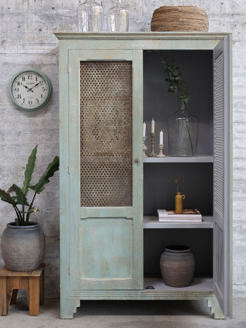 Ta wyjątkowa szafa inspirowana jest meblami z dawnych lat. Wygląda jak ze starego dworku lub domu w stylu country chic. Jest to mebel stworzony do wysmakowanych wnętrz z duszą, gdzie detale mają znaczenie. Taka stylizowana szafa wspaniale wypełni przestrzeń i wpisze się w wiele stylizacji. Szafa ozdobi zarówno klimatyczną jadalnię czy salon jak również sypialnię lub przedpokój w stylu shabby.