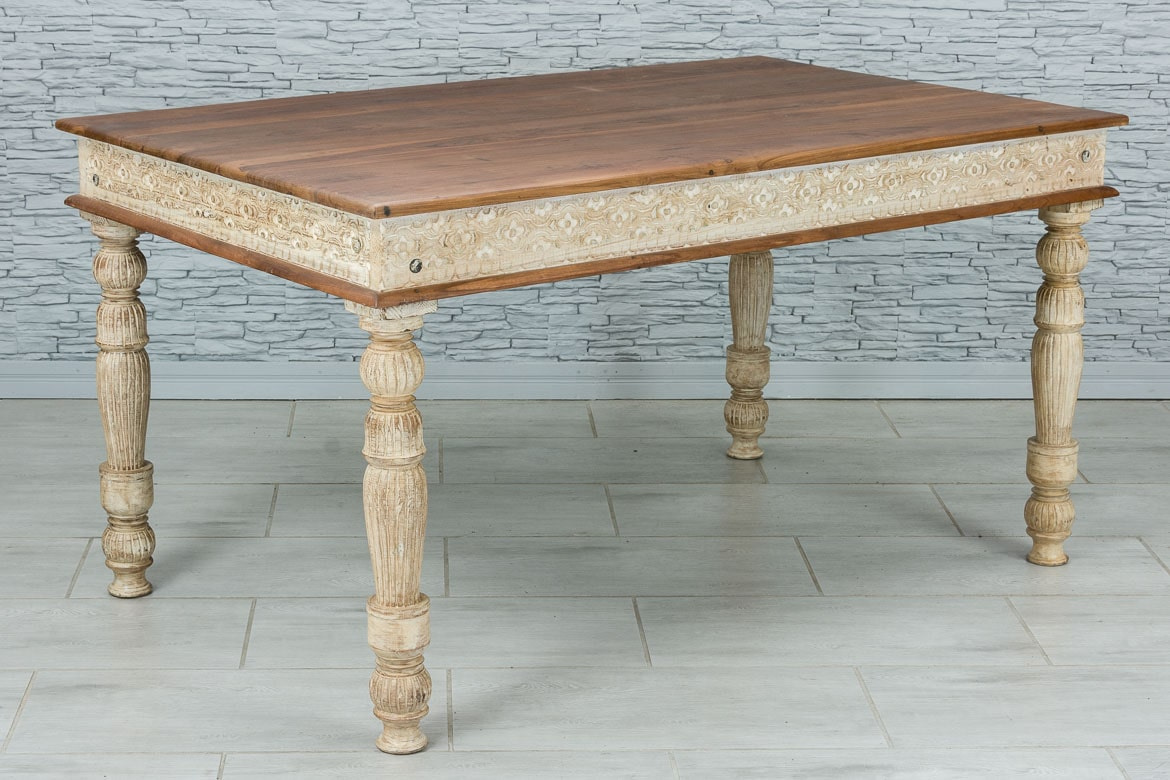 Prostokątny stół drewniany z Indii, wykonany z litego drewna mango i odzyskanego drewna tekowego. Nogi toczone w stylu antycznym, idealnie komponują się z rzeźbionym rantem blatu. Można je łatwo zdemontować w razie potrzeby. Polecamy do wnętrz orientalnych i kolonialnych. Przy stole usiądzie wygodnie sześć osób.