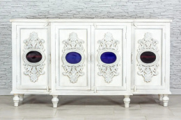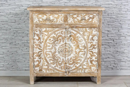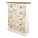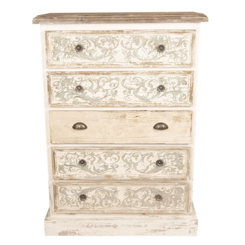 Projekt marki Clayre & Eef, która zadbała o dobry, ponadczasowy design i praktyczność w jednym. Komodę poddano procesowi postarzania. Liczne przecierki, spękania i odpryski są efektem całkowicie zamierzonym. Komoda posiada pięć szuflad z pięknie rzeźbionymi frontami. Orientalne uchwyty pięknie dopełniają całość. To praktyczna ozdoba Twojej sypialni, salonu lub przedpokoju.