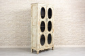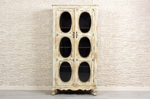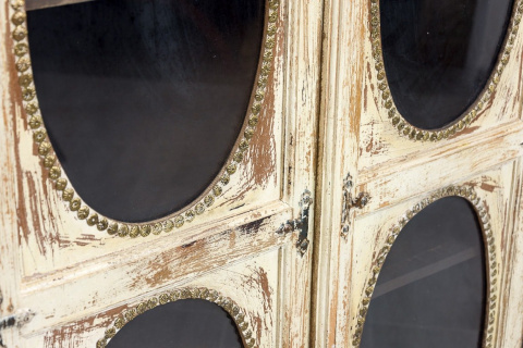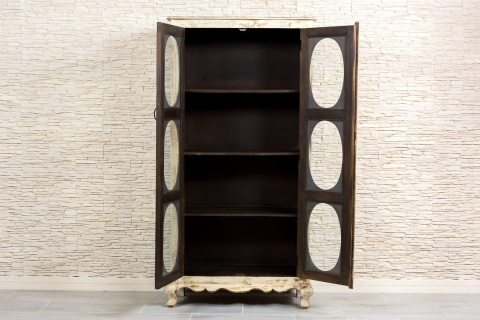 Szafa wykonana z drewna mango w indyjskiej stolarni. Mebel postarzony i przecierany specjalną techniką. Swój wyjątkowy wygląd zawdzięcza połączeniu drewna z mosiężnymi okuciami i ćwiekami. Owalne przeszklenia nadają jej lekkości i oryginalności. Witryna posiada trzy pojemne półki.