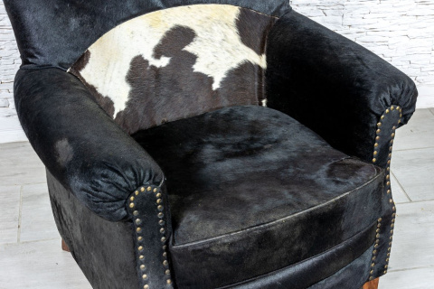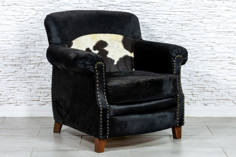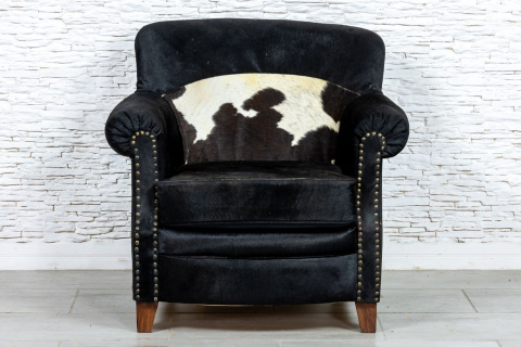 Fotel wykonany w niewielkiej rodzinnej manufakturze w Indiach. Fotel wykonano z litego drewna mango i obito skórą z włosiem w naturalnym odcieniu. Ma klasyczny kształt i jest niezwykle wygodny. Stylowe podłokietniki i plecy mebla ozdobiono dodatkowo mosiężnymi ćwiekami. Łaciate oparcie bardzo ładnie kontrastuje z mieniącą się czernią. Dzięki swojemu nietuzinkowemu designowi jest również bardzo uniwersalny stylistycznie.