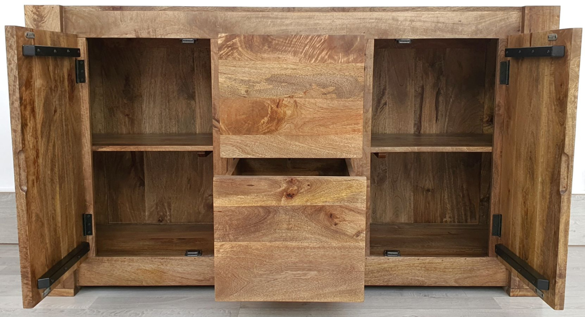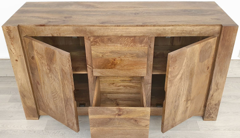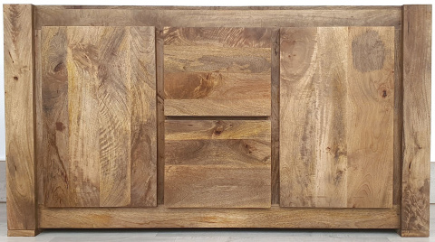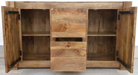 Ten mebel został wykonany z wysokiej jakości drewna mango i wykończony w odcieniu toffi. Faktura egzotycznego drewna sprawia, że mimo swojej prostej formy, komoda jest bardzo oryginalna. Ten niezwykle pojemny i praktyczny mebel posiada dwie głębokie szuflady na metalowych prowadnicach, które pomieszczą wiele ubrań, dokumentów lub innych przedmiotów oraz dwie szafki z półkami.